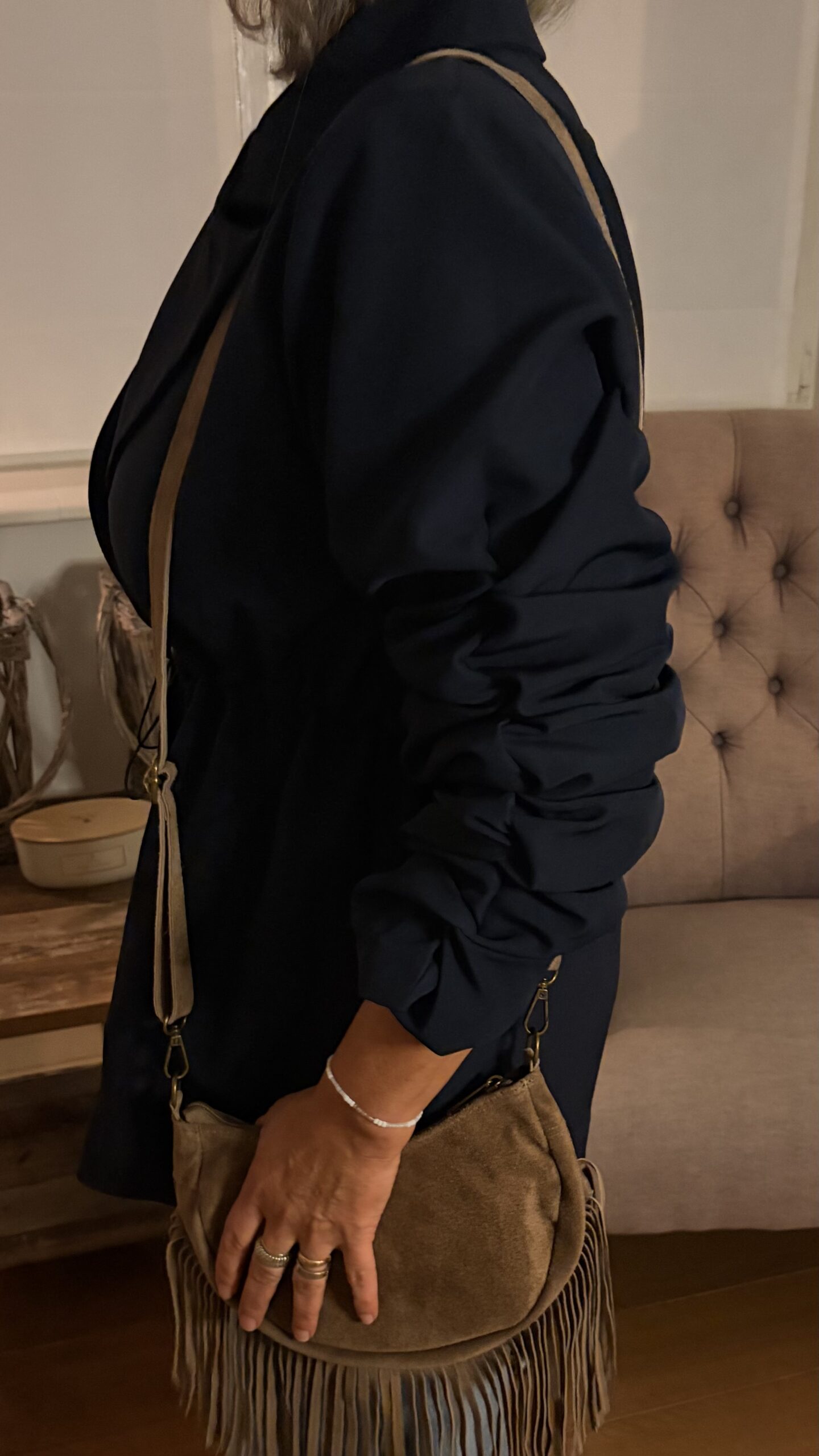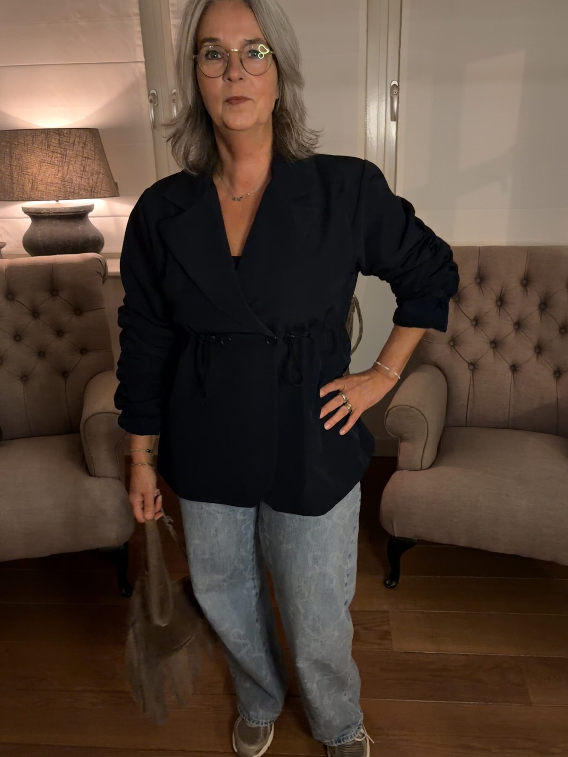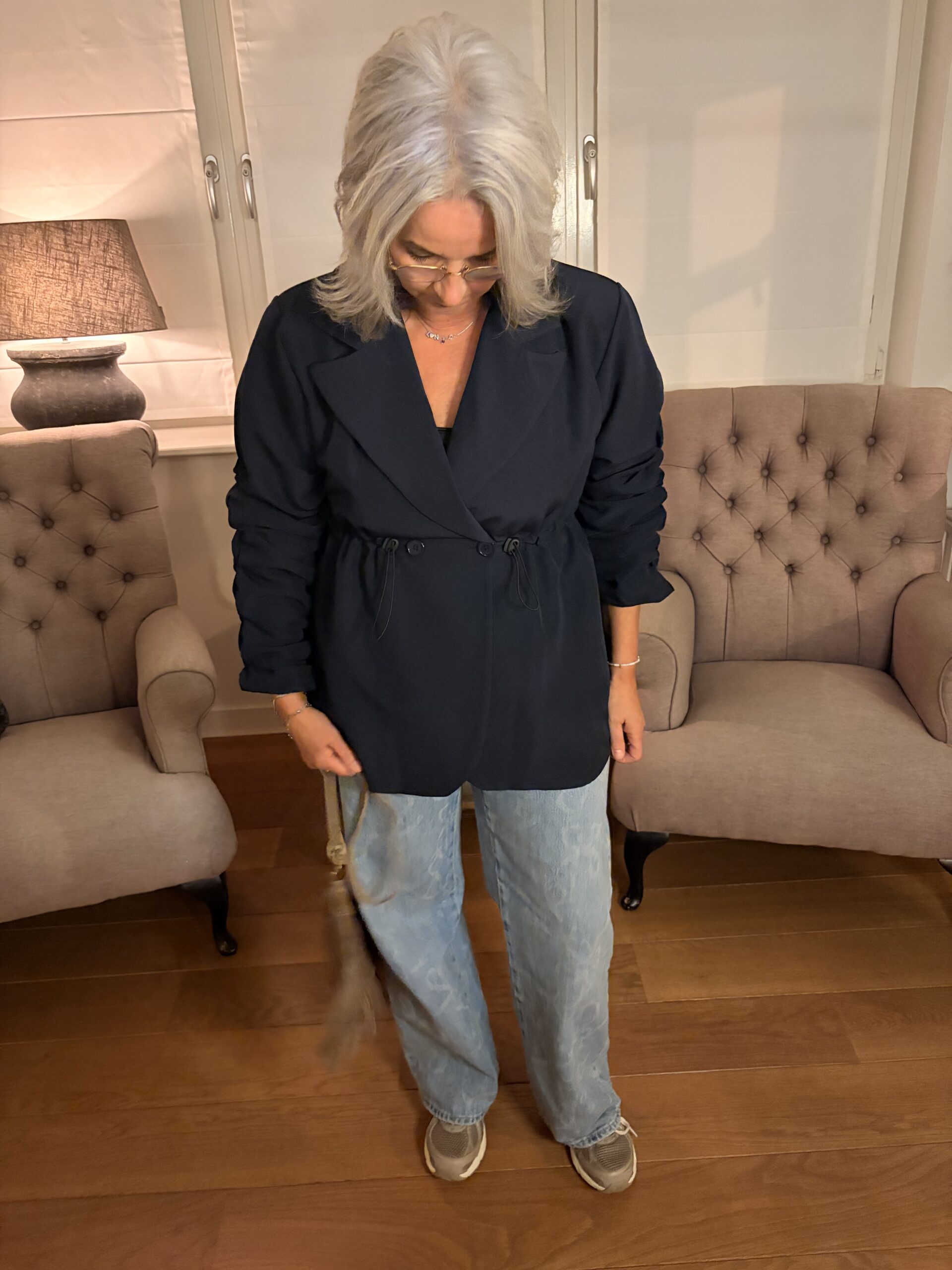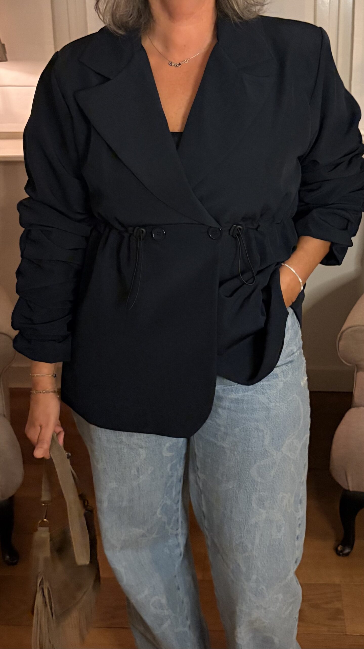 Beschrijving: Deze Blazer is met elastiek smaller te maken in de taille, knoopsluiting voor, gerimpelde mouwen, gevoerd, One Size