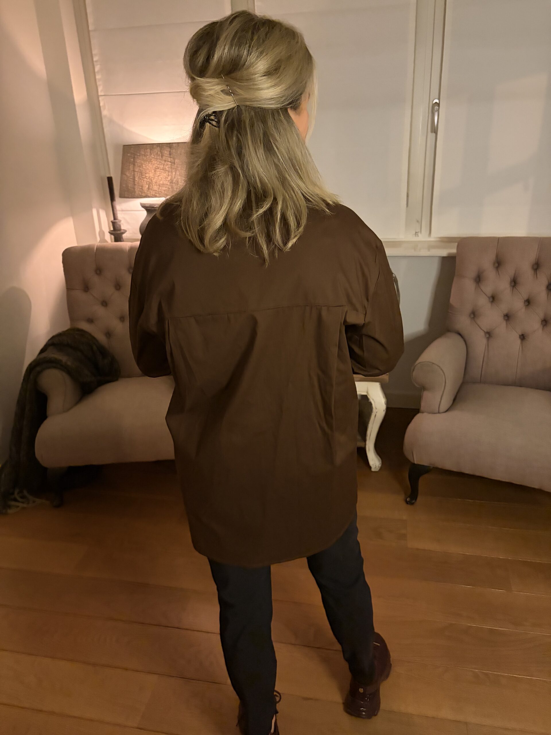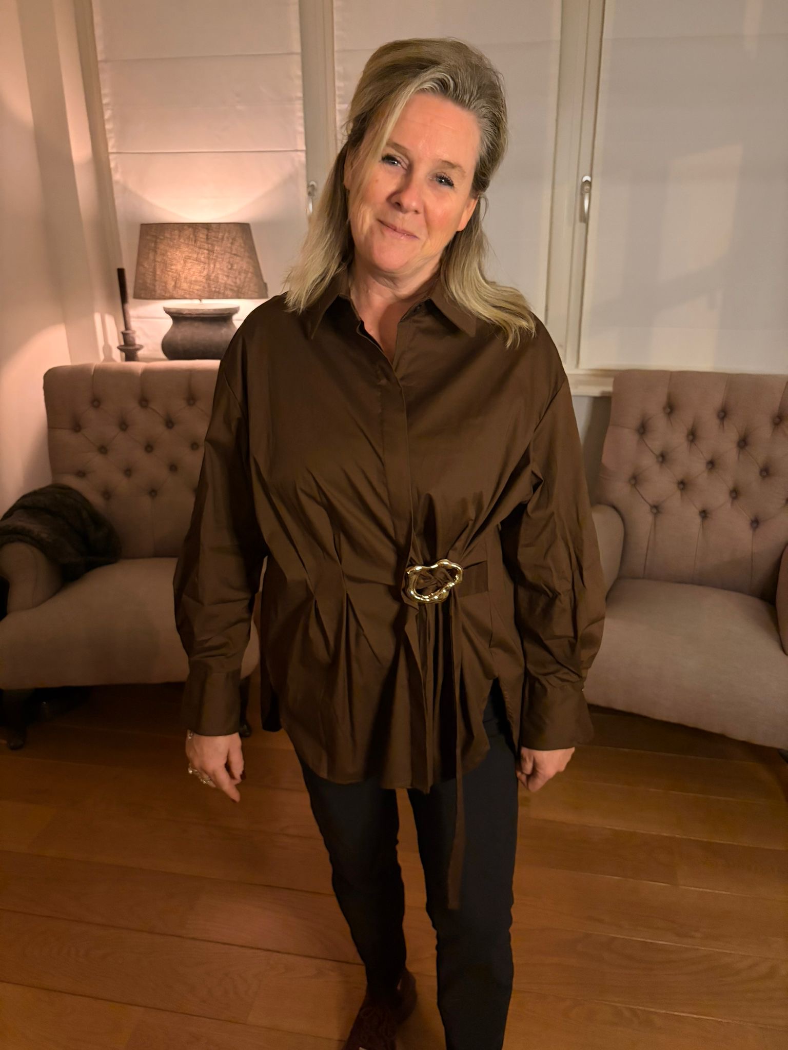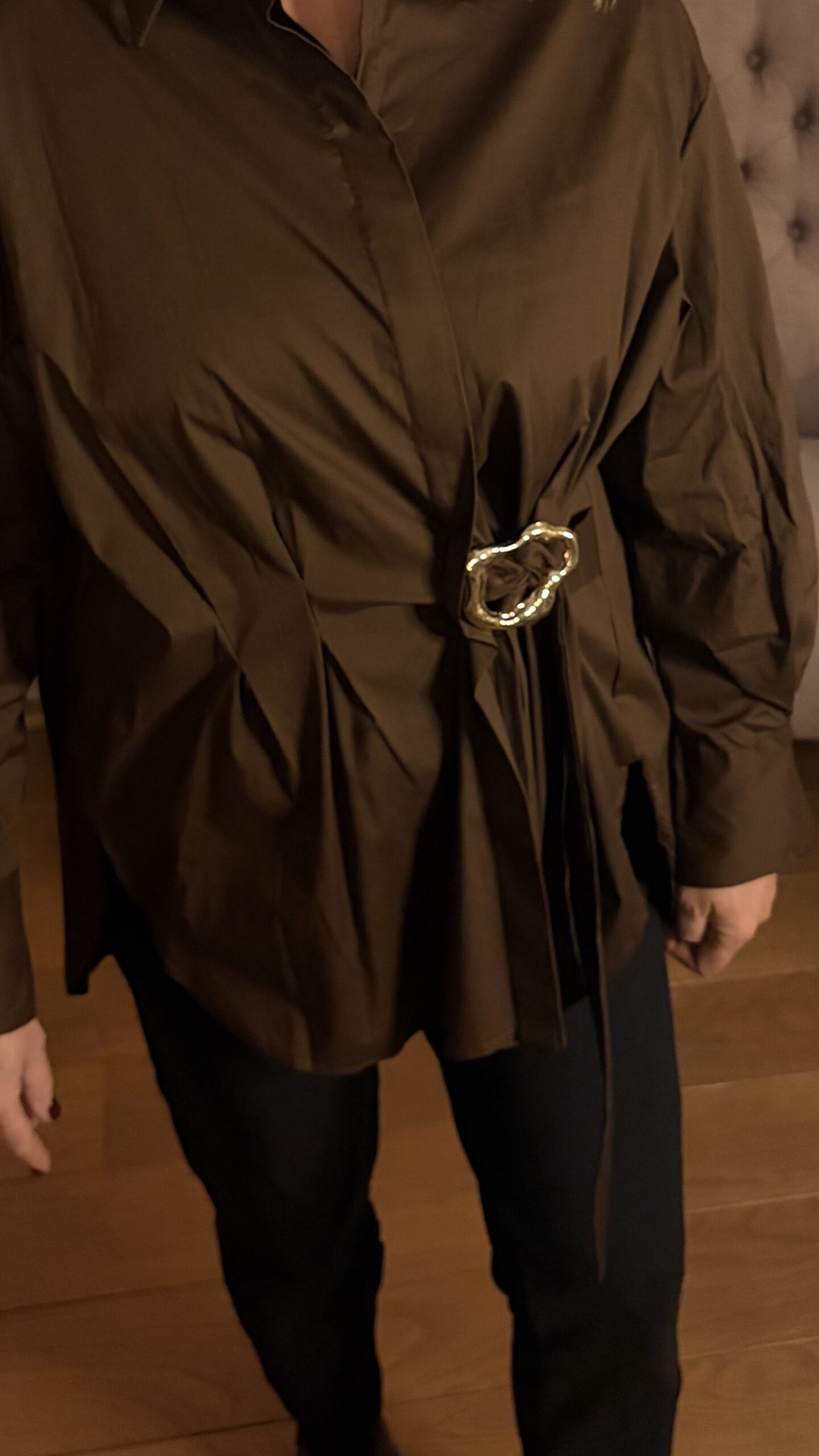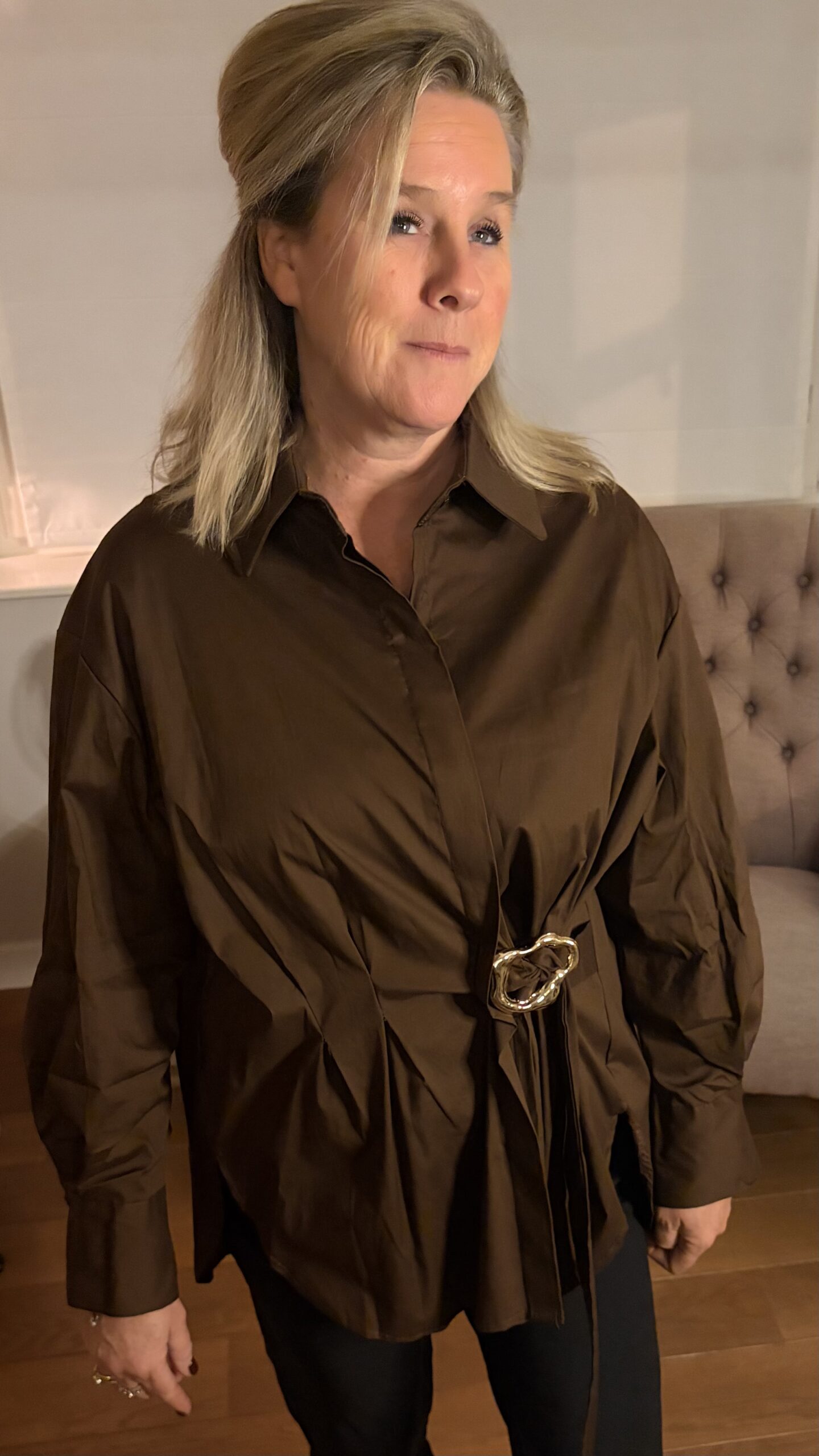 Omschrijving: Langere ruimvallende Blouse, lange mouw op te halen naar een korte mouw, Voor Knoopsluiting, voorpand goudkleurige gesp met Lind waarmee de blouse iets te tailleren is