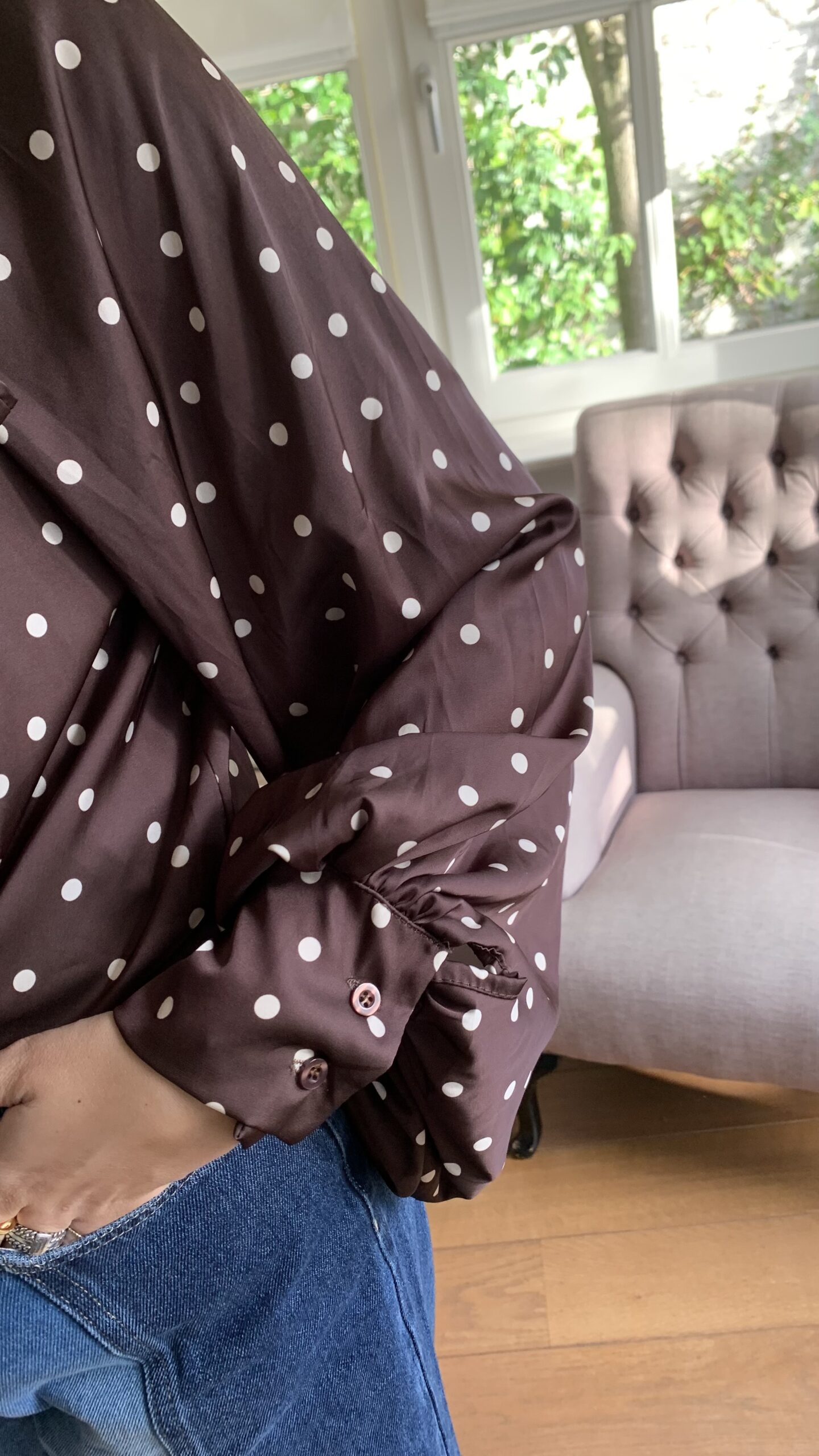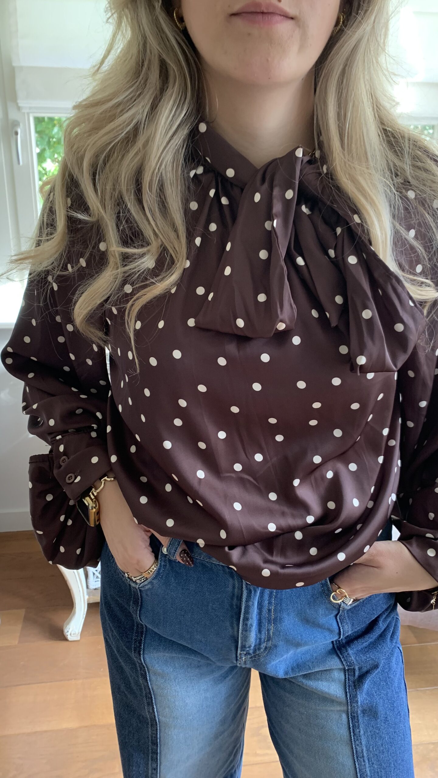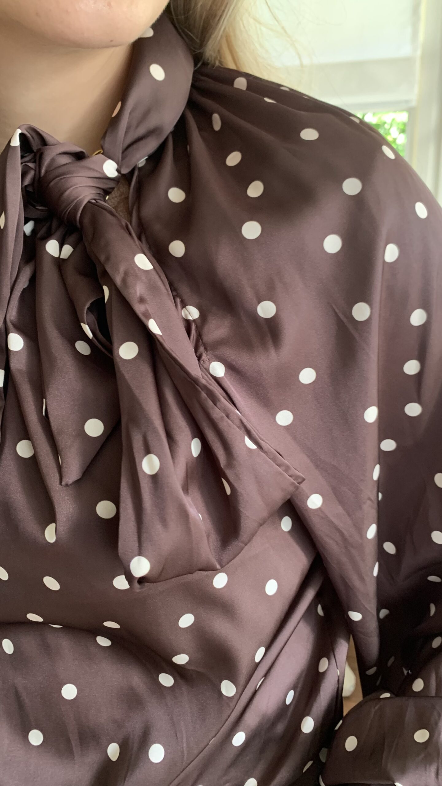 Omschrijving: Blouse met lange iets poffende mouw, recht model met in de hals een strik