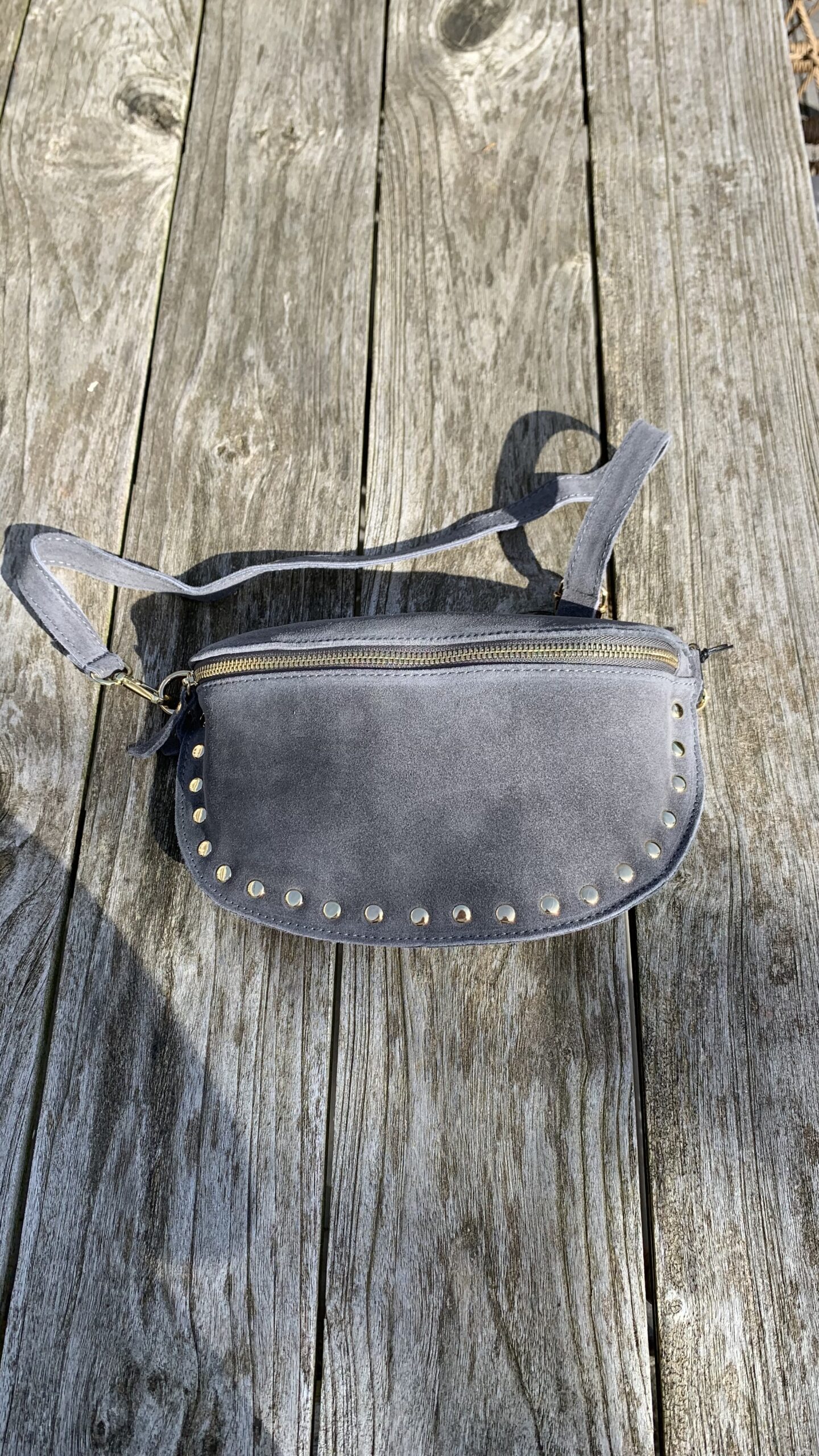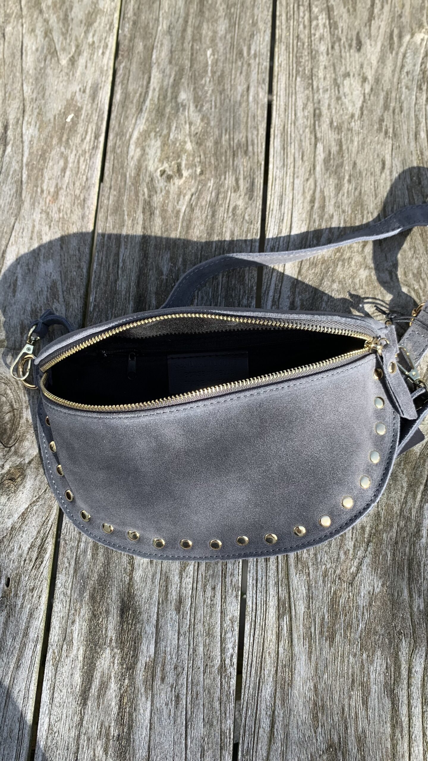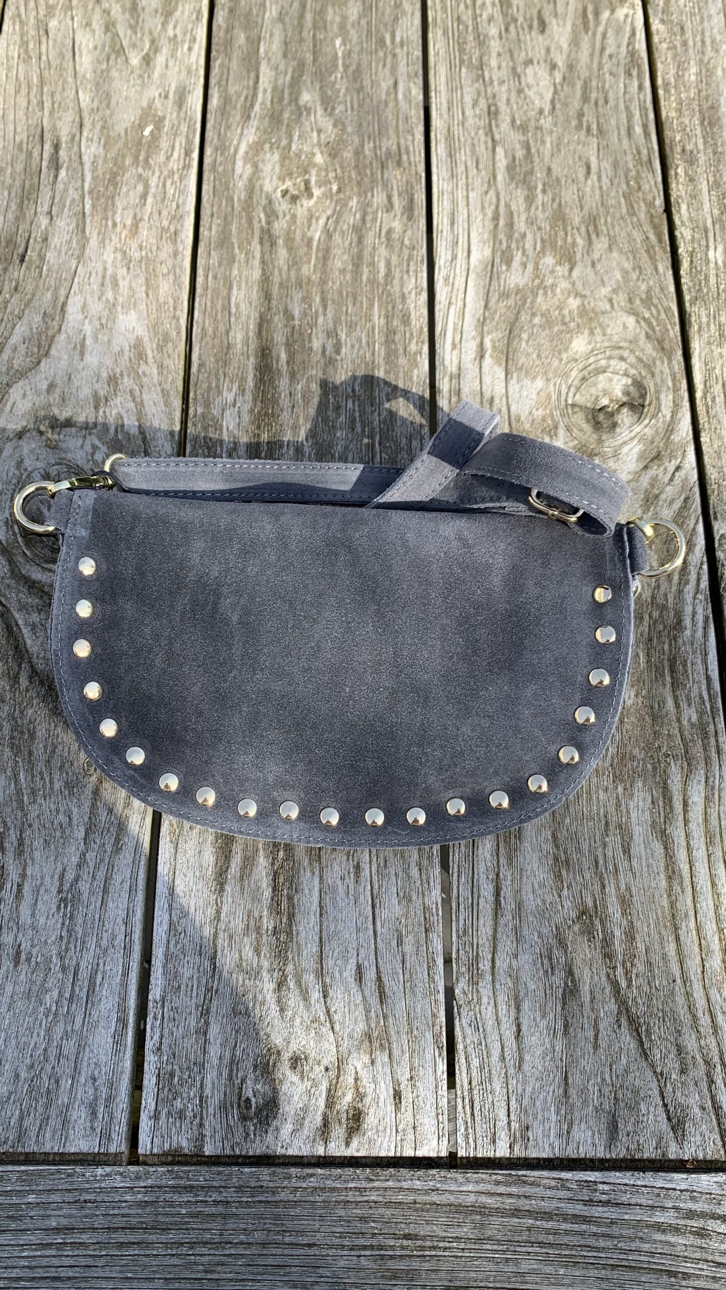 Beschrijving: Dit tasje heeft één groot vak met daarin een klein vakje met rits, de tas sluit met een rits, met een draagriem van hetzelfde materiaal, de tas is afgewerkt met studs