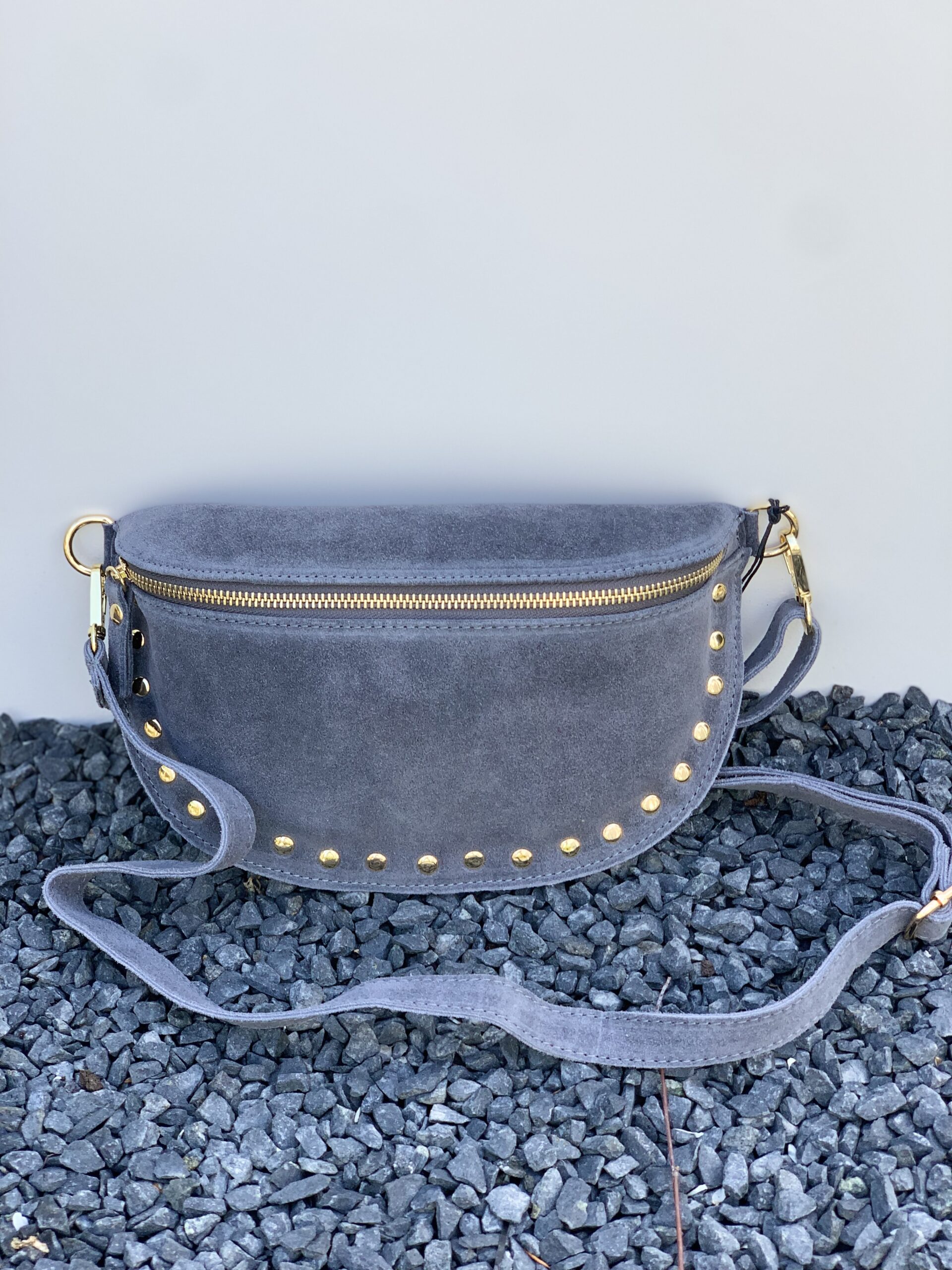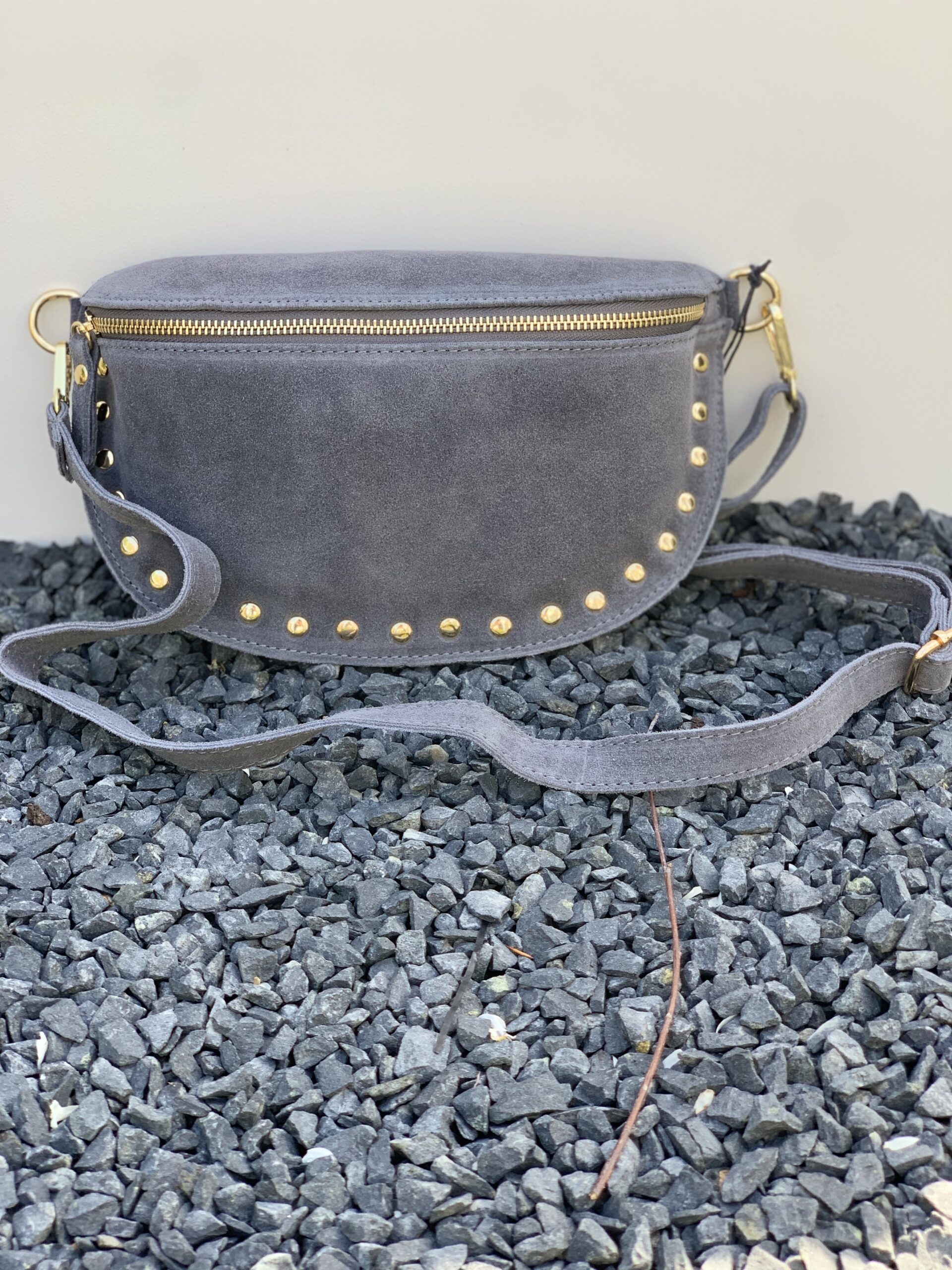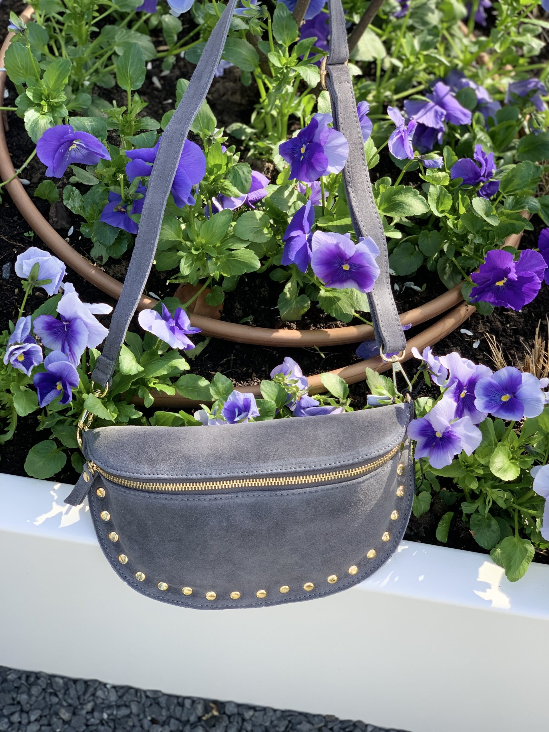 Beschrijving: Dit tasje heeft één groot vak met daarin een klein vakje met rits, de tas sluit met een rits, met een draagriem van hetzelfde materiaal, de tas is afgewerkt met studs