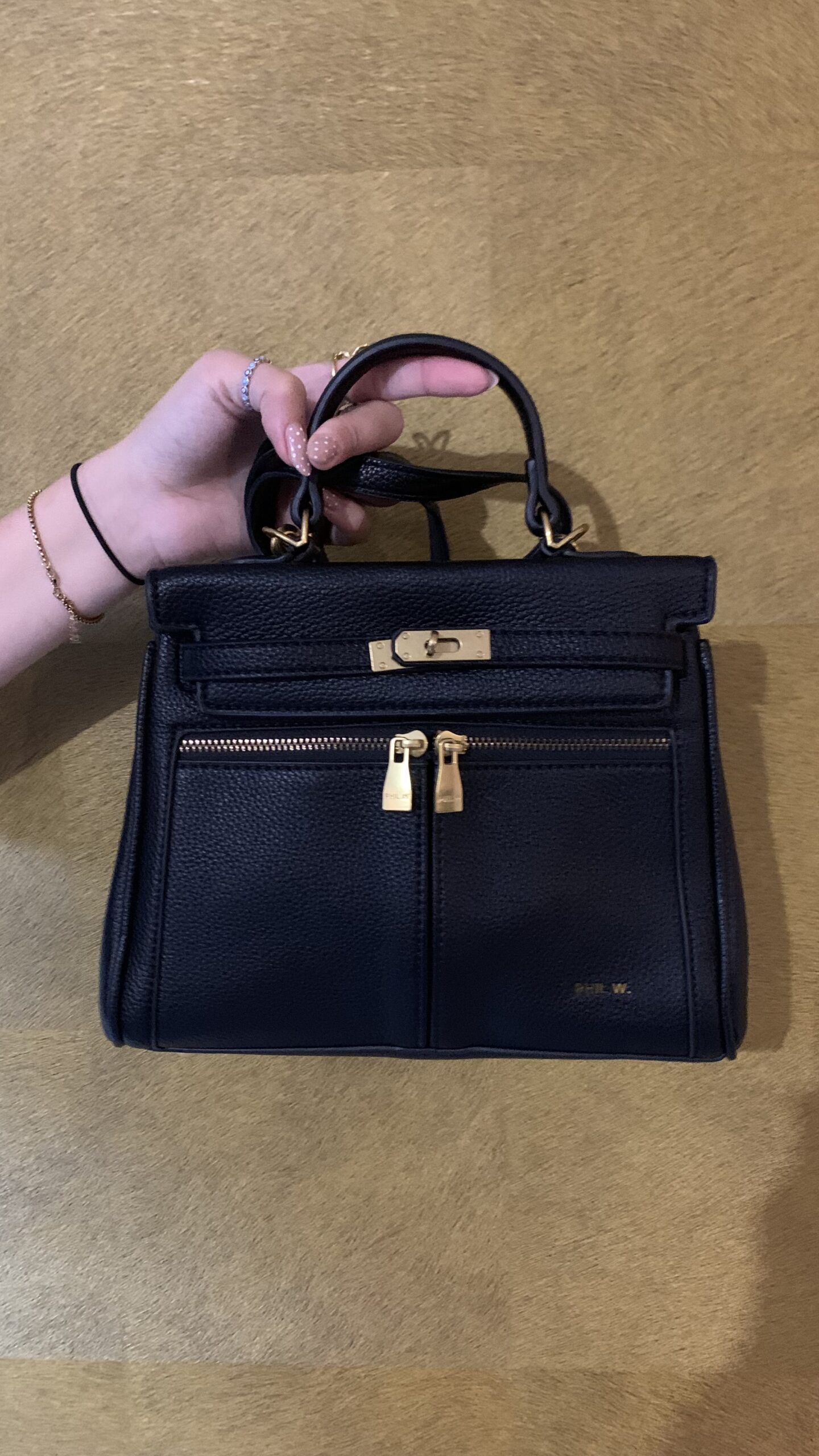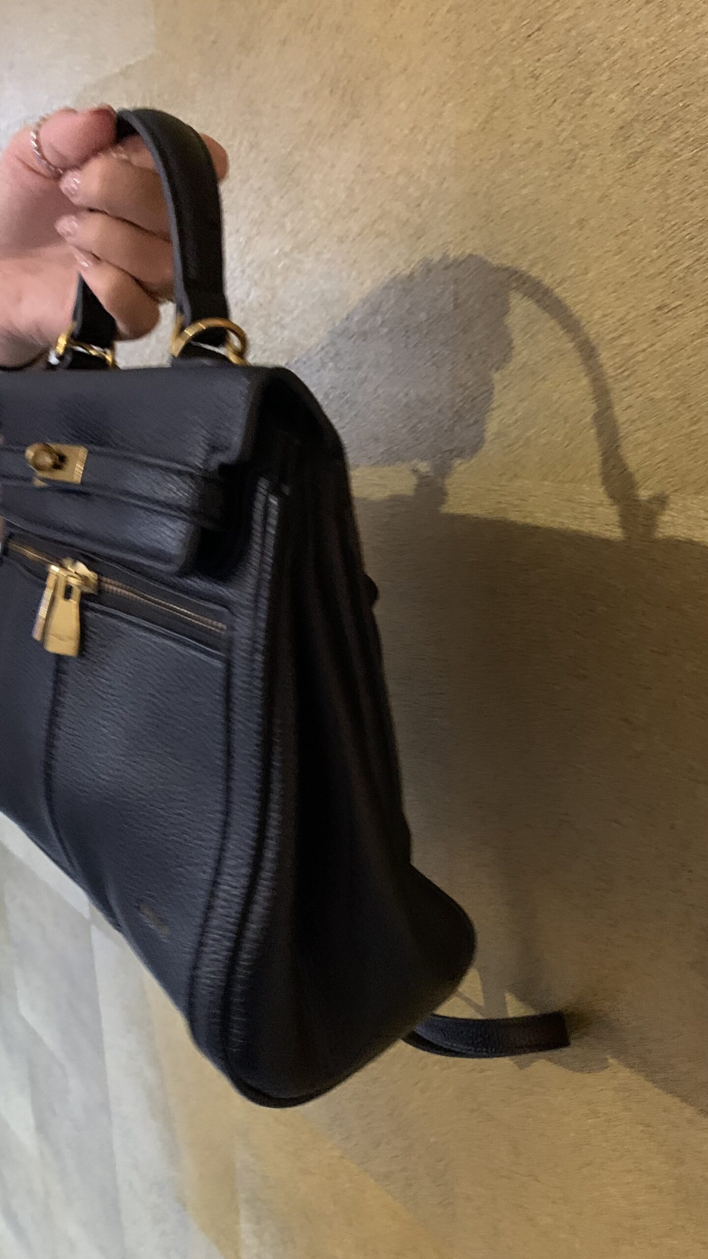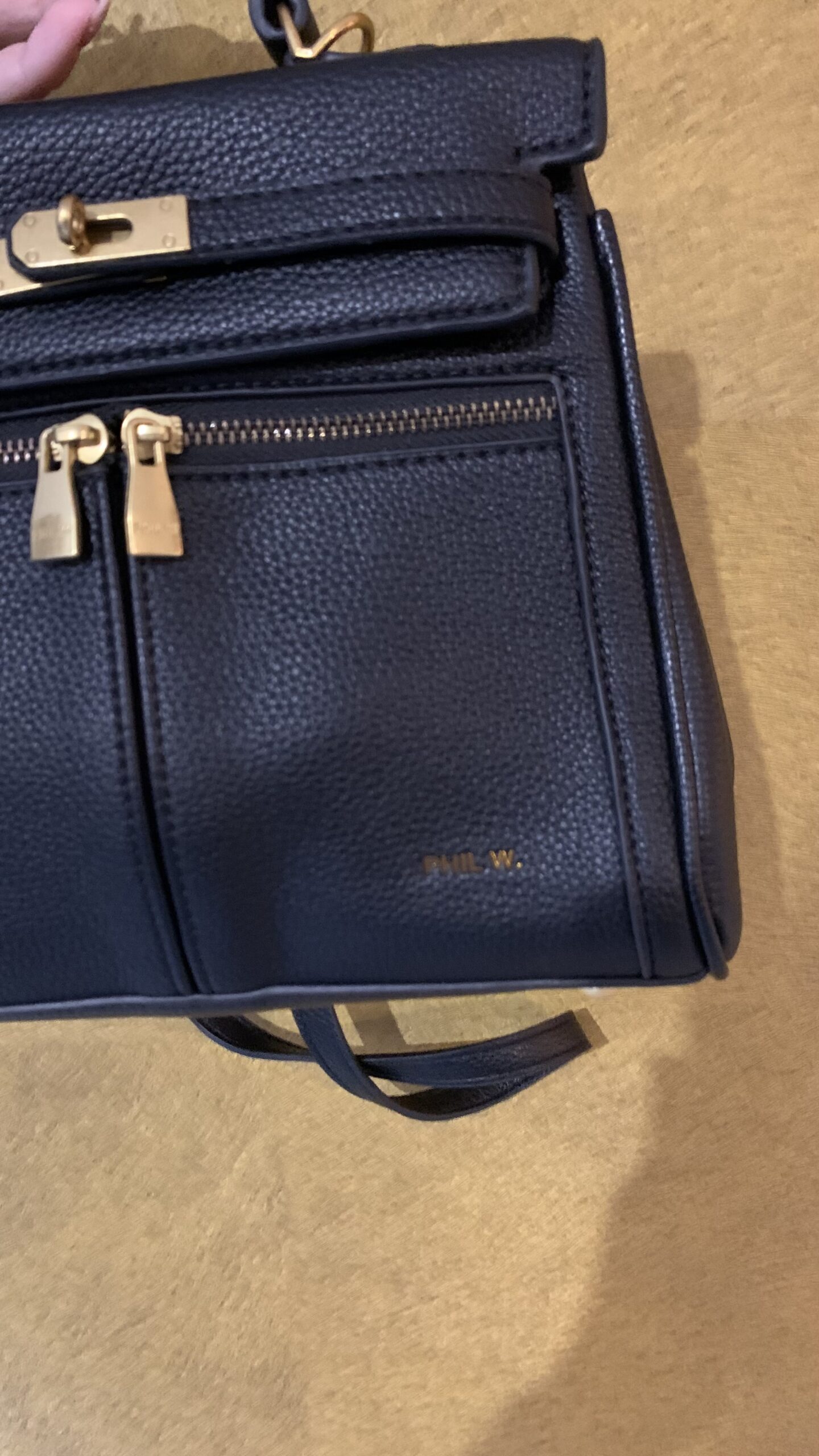 Beschrijving: Een Tas met draaisluiting voor, bestaande uit een groot midden vak met daarin 1 insteek vak en 1 vak met rits