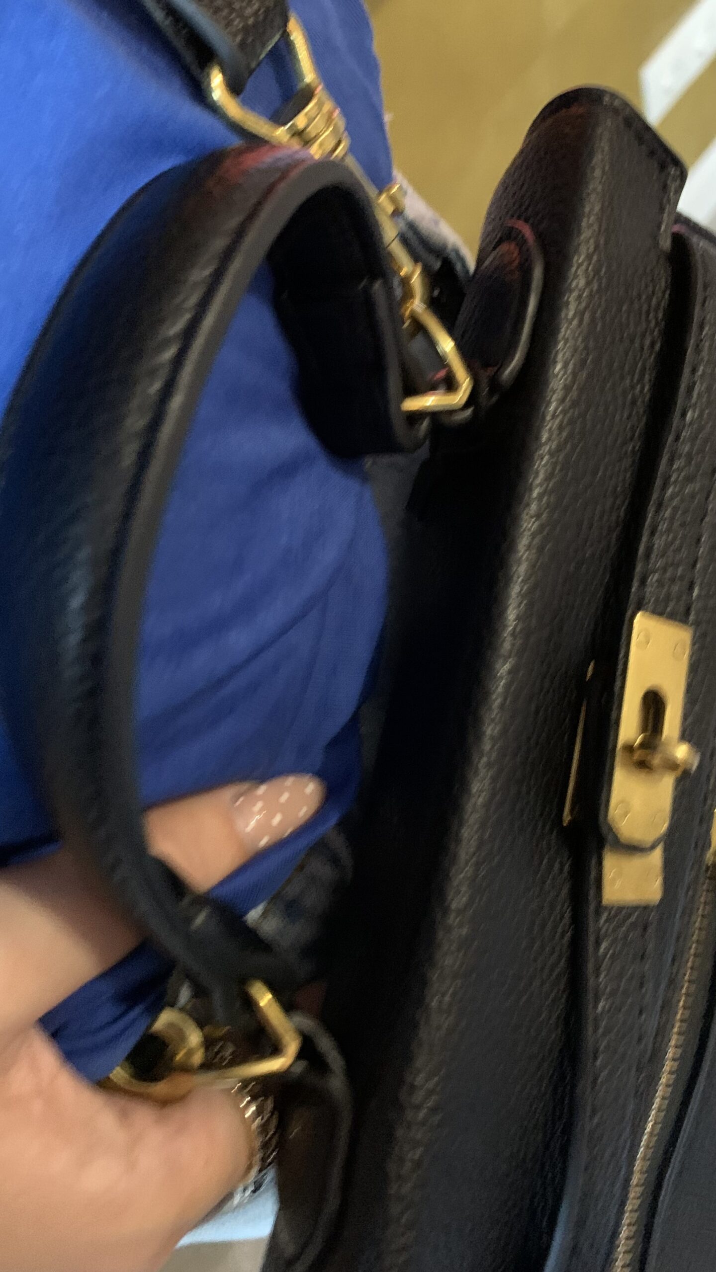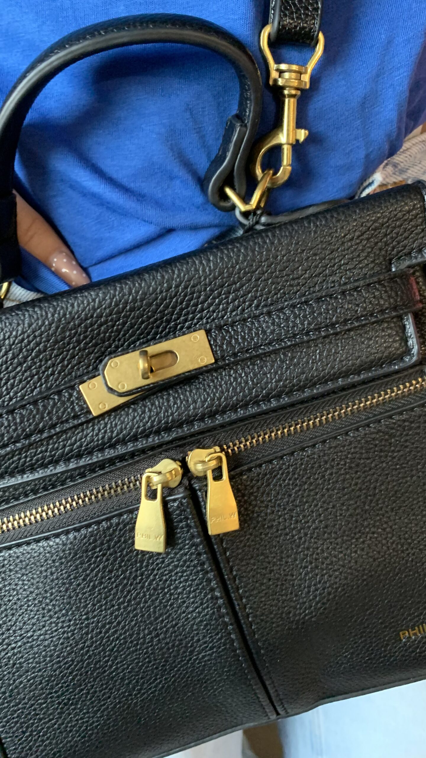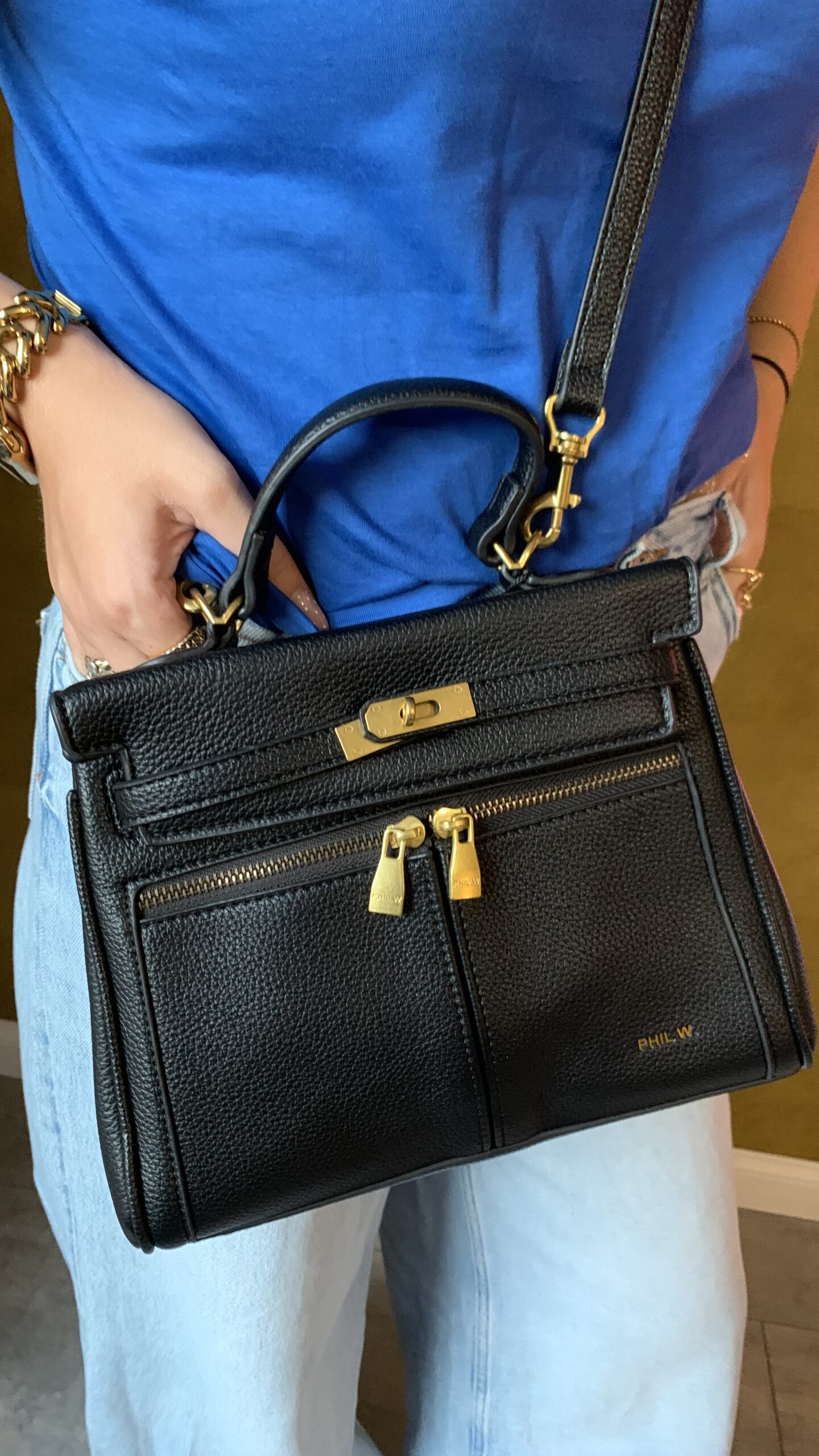 Beschrijving: Een Tas met draaisluiting voor, bestaande uit een groot midden vak met daarin 1 insteek vak en 1 vak met rits
