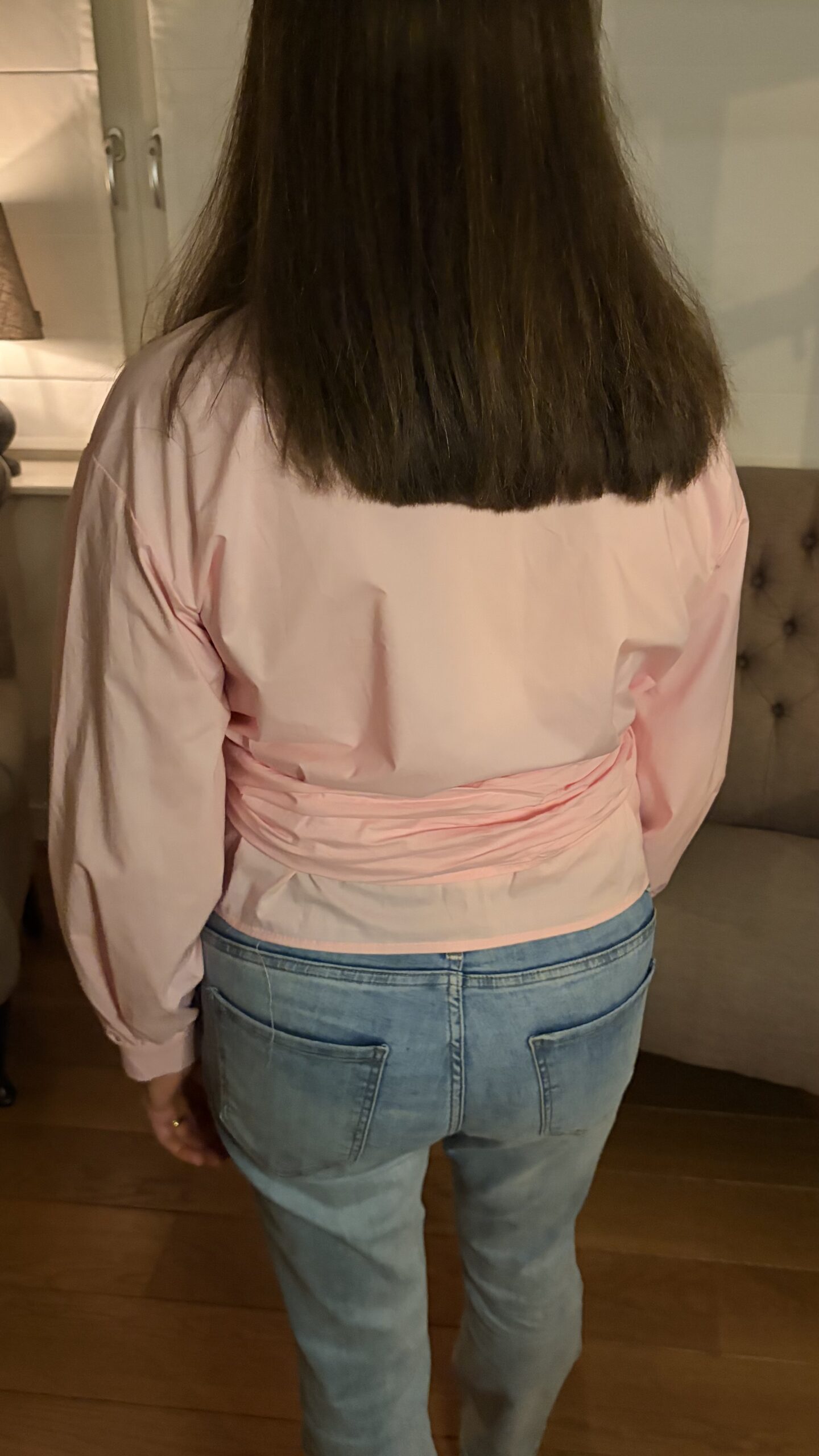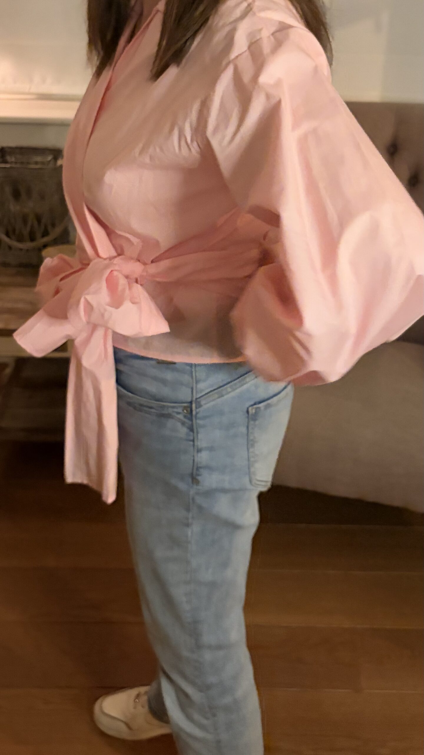 Omschrijving: korte Blouse, lange pof mouw, sluit door een brede band van dezelfde stof die je voor kunt strikken