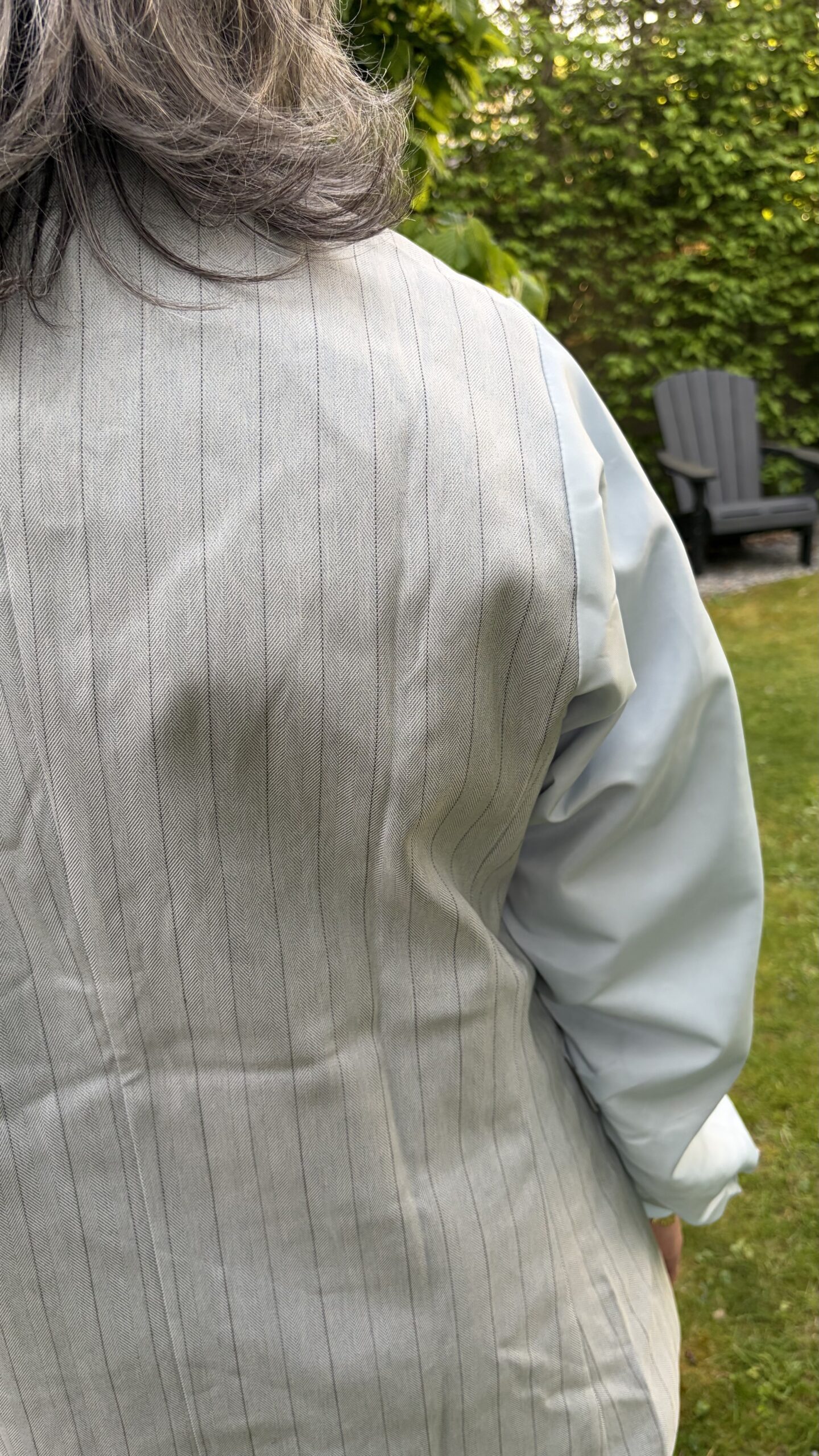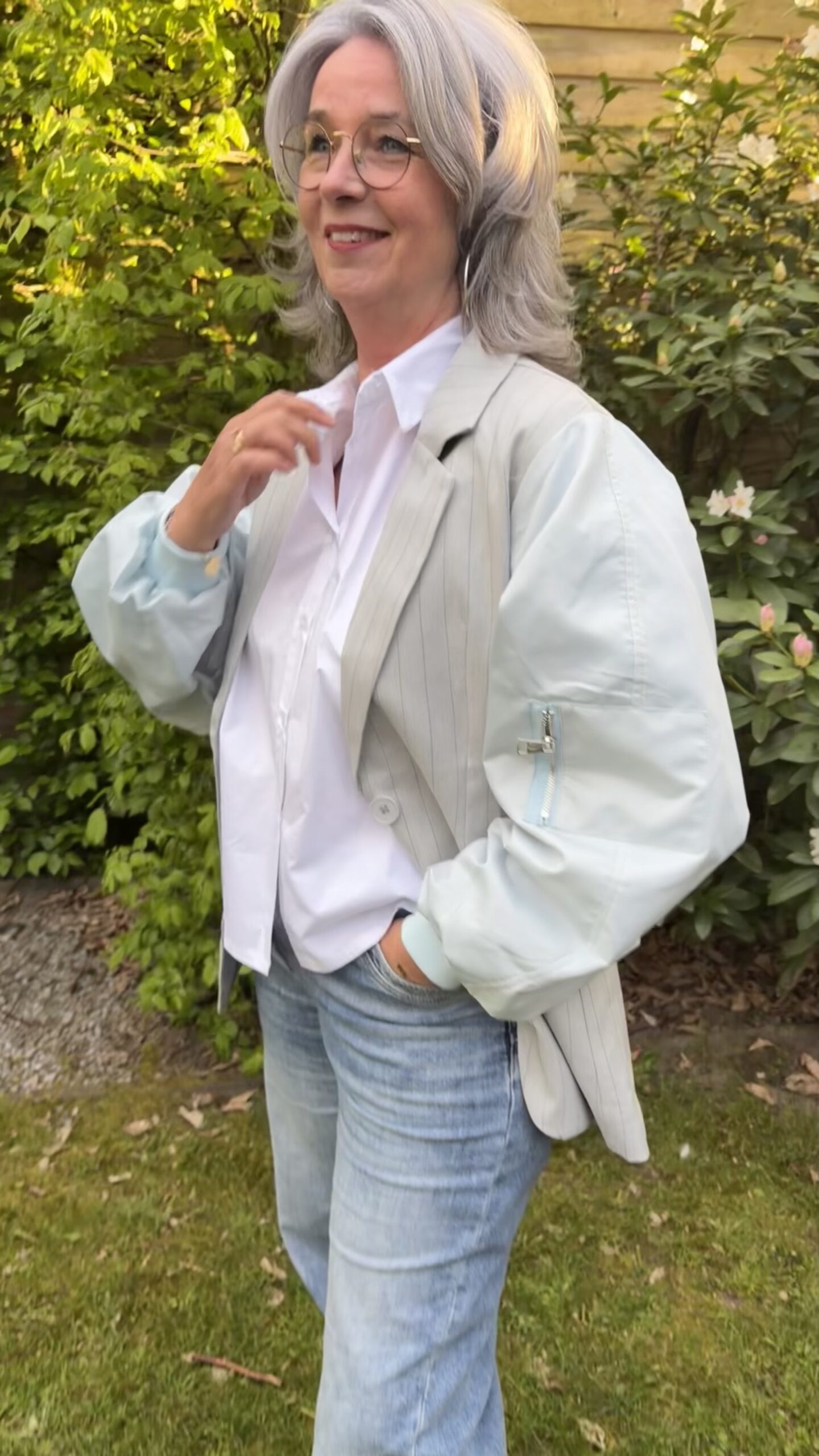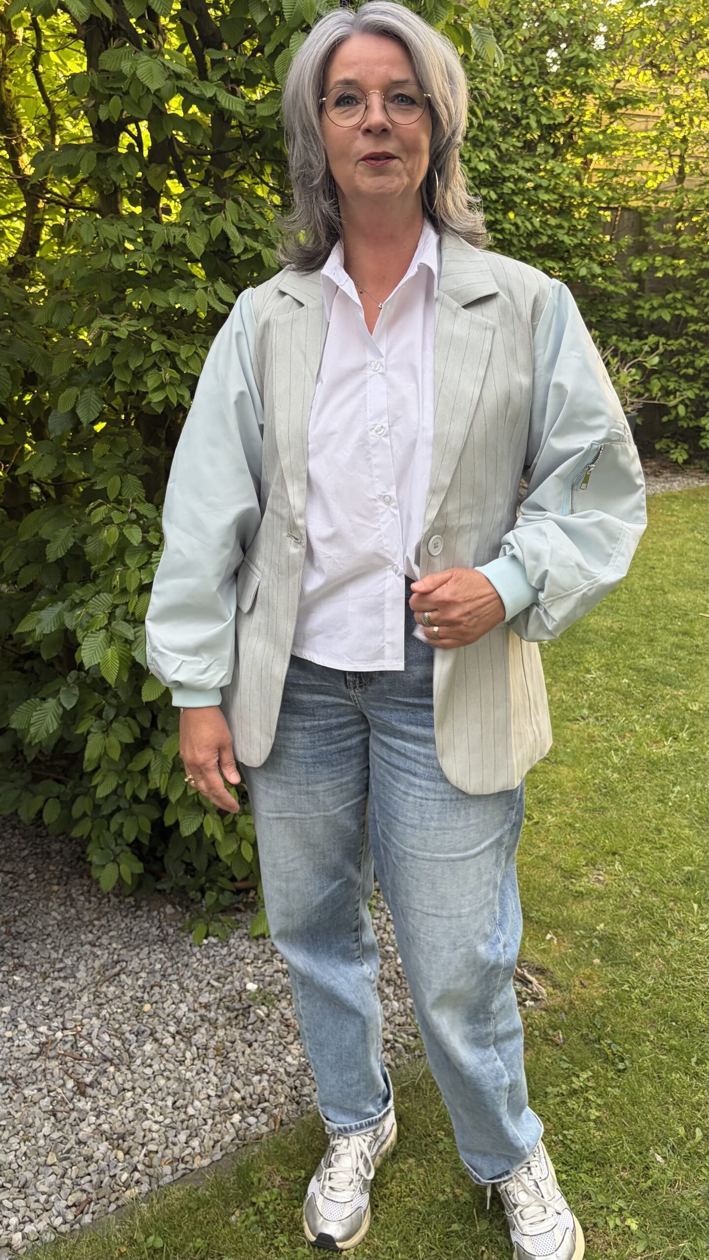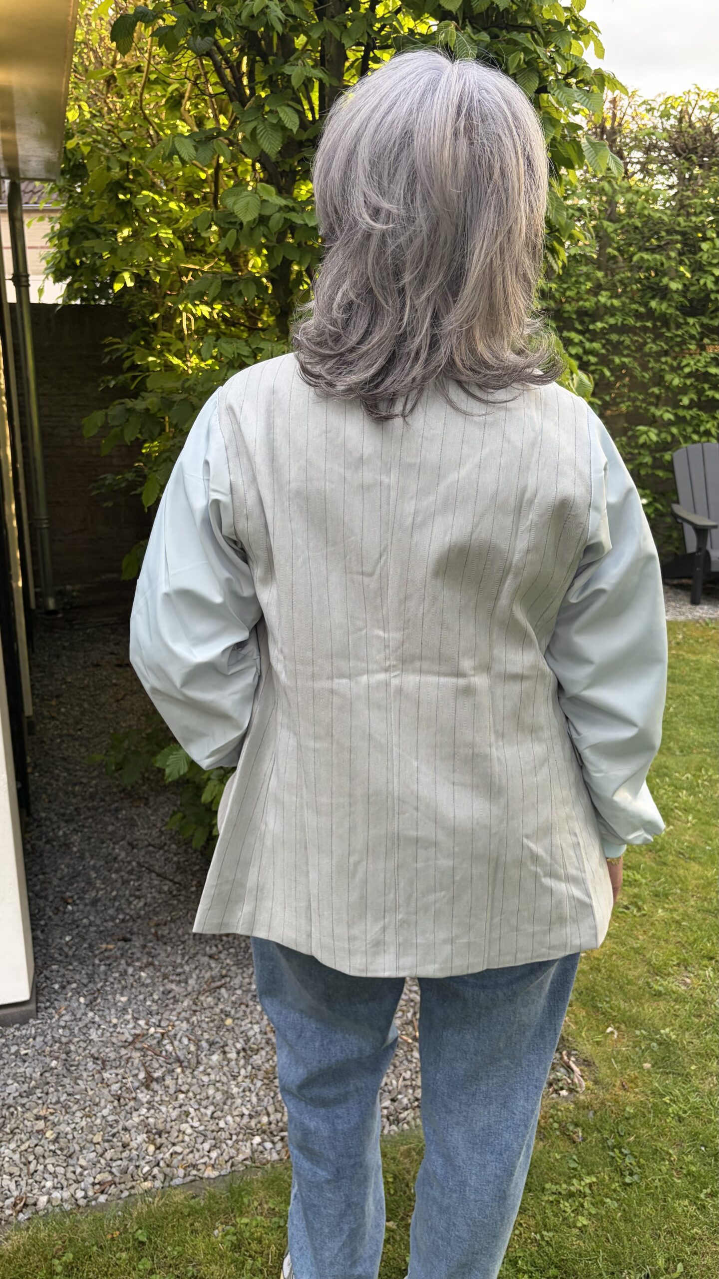 Beschrijving: Blazer Krijtstreep lichtblauw, reverse kraag, 1 knoop voor, 2 klepzakjes
