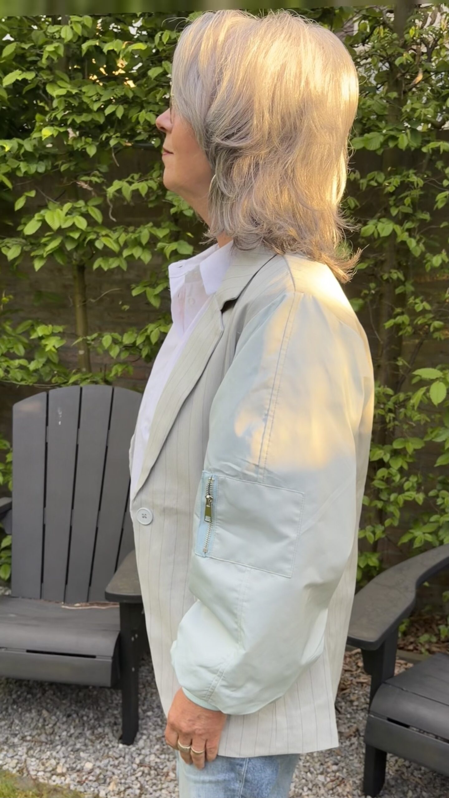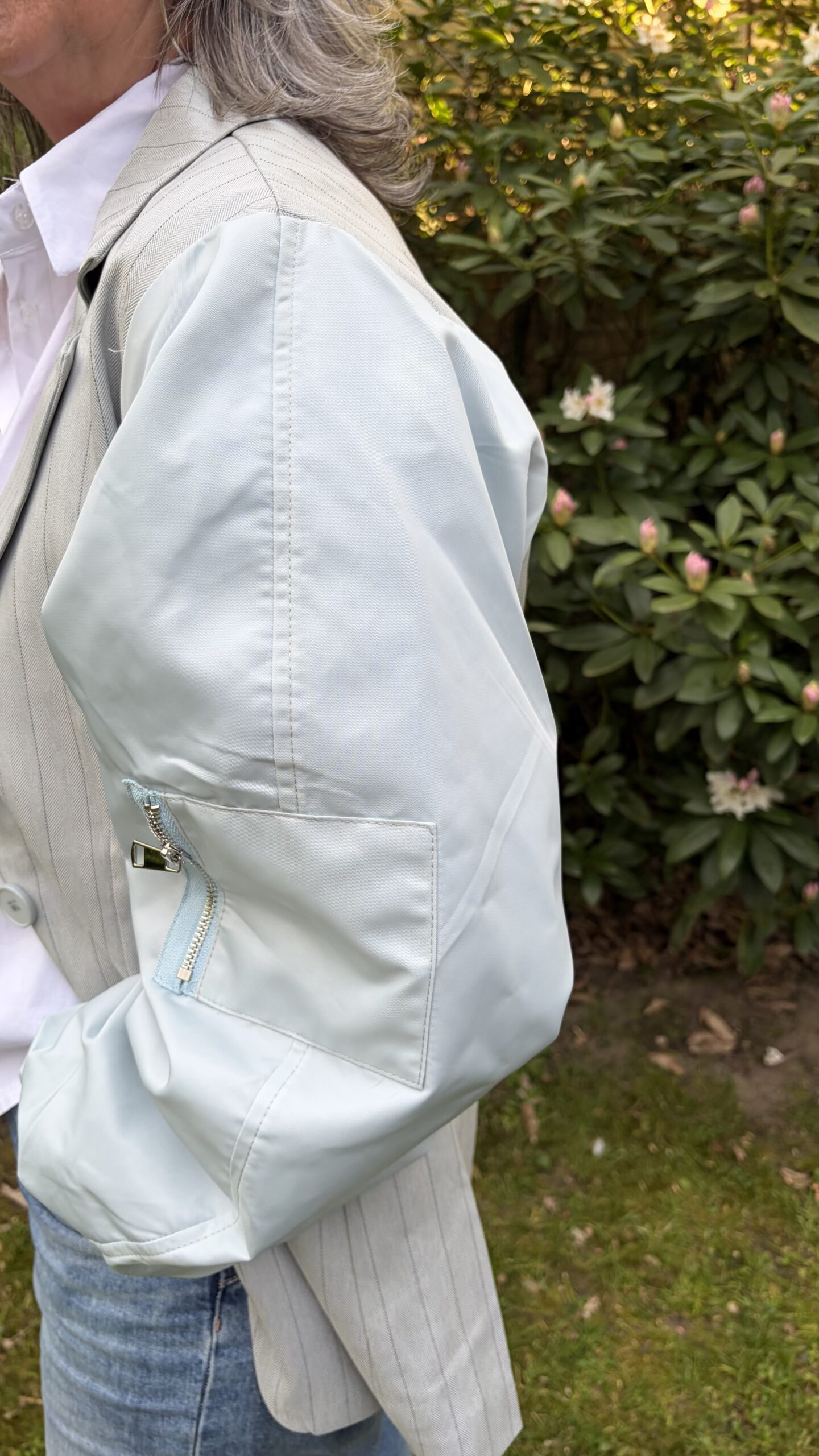 De mouwen zijn van een effe stof, model mouw ballon op 1 mouw een klein zakje met rits