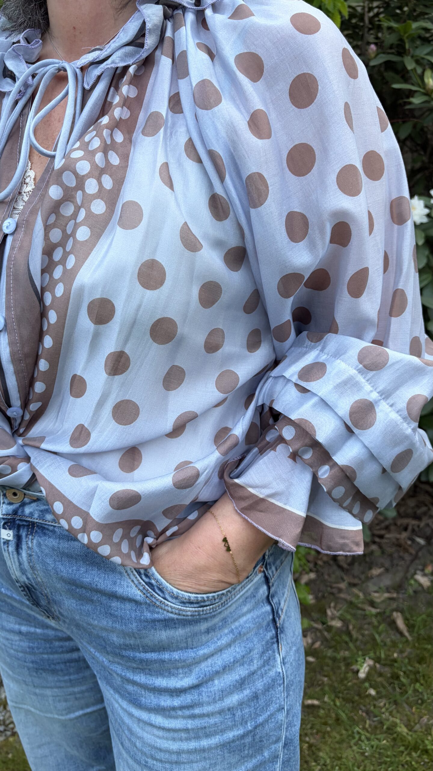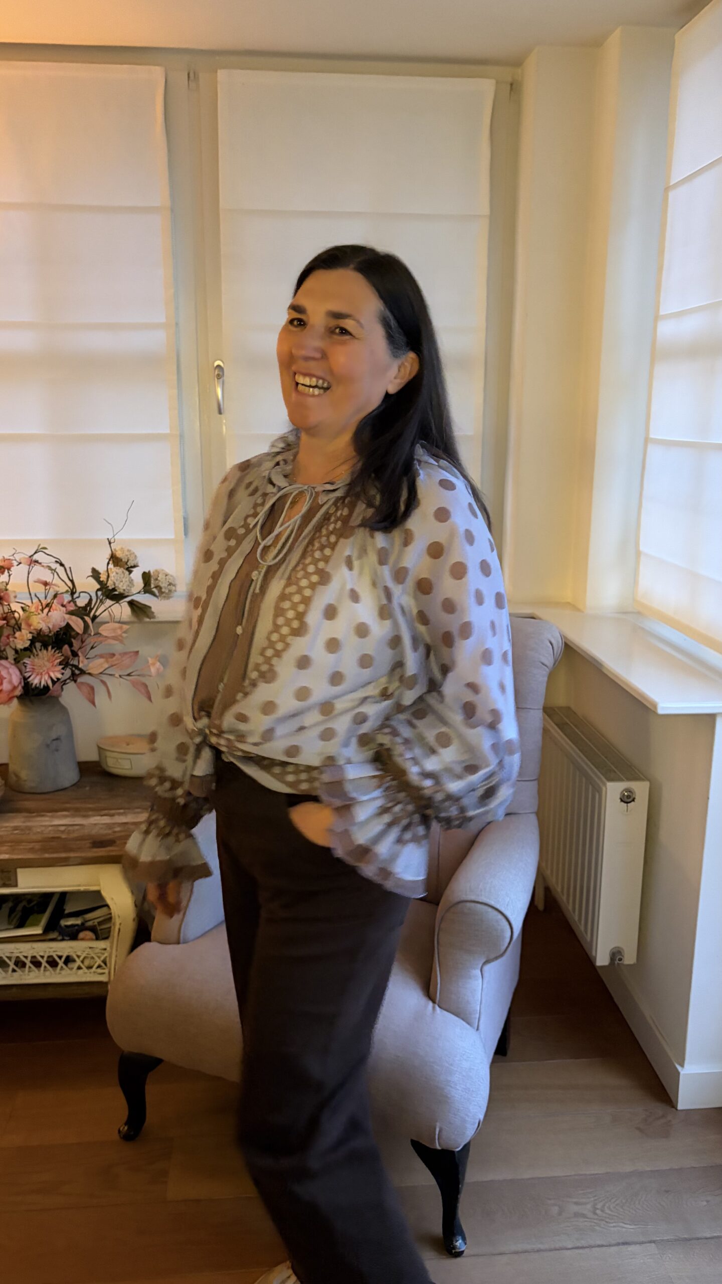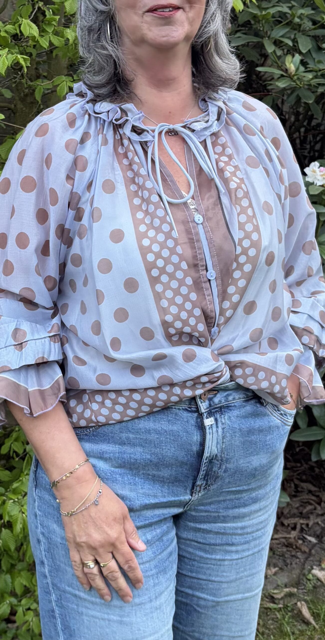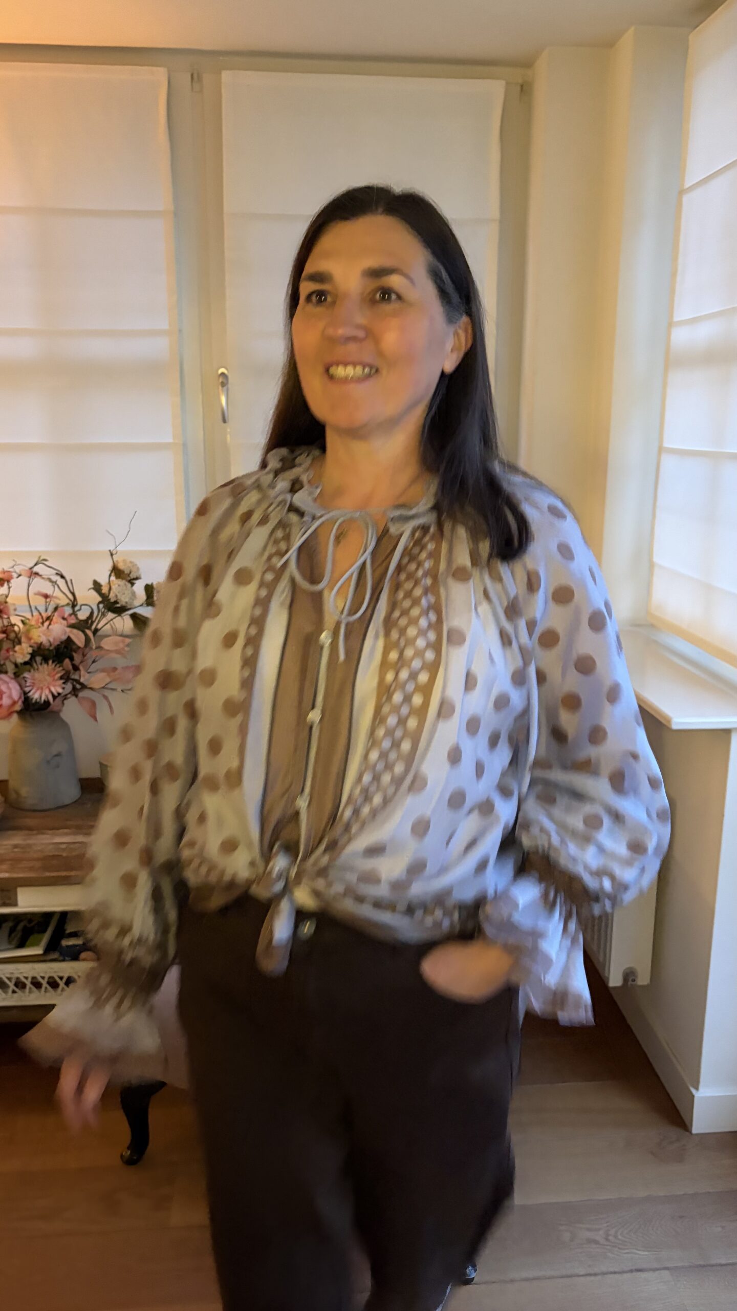 Omschrijving: Blouse met lange brede mouw elastiek met uitlopende boord, recht model met knopen