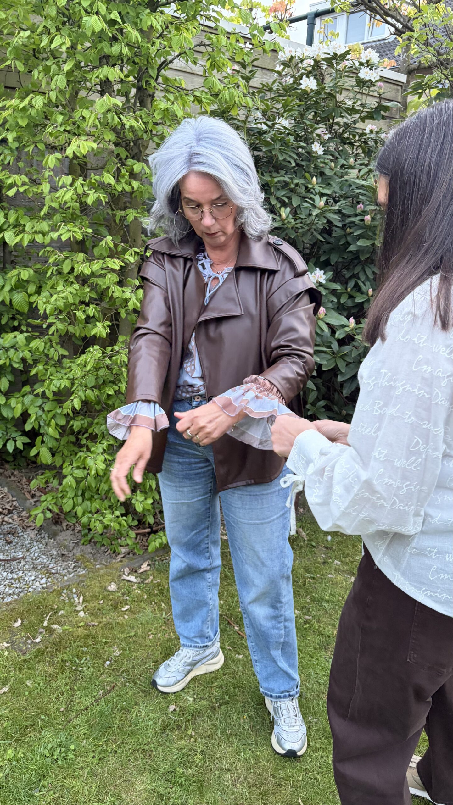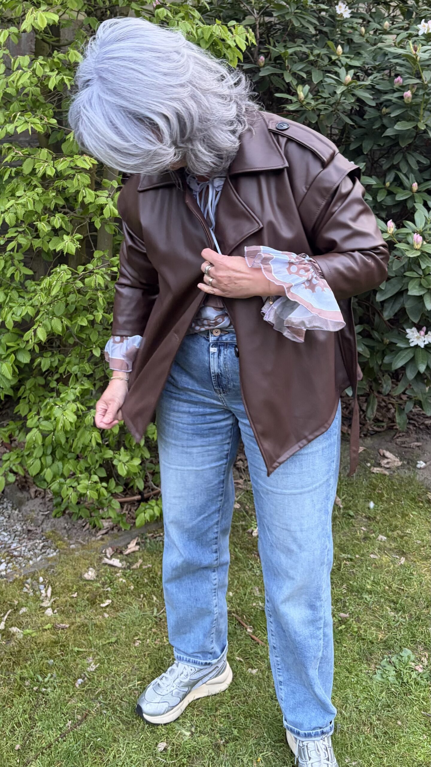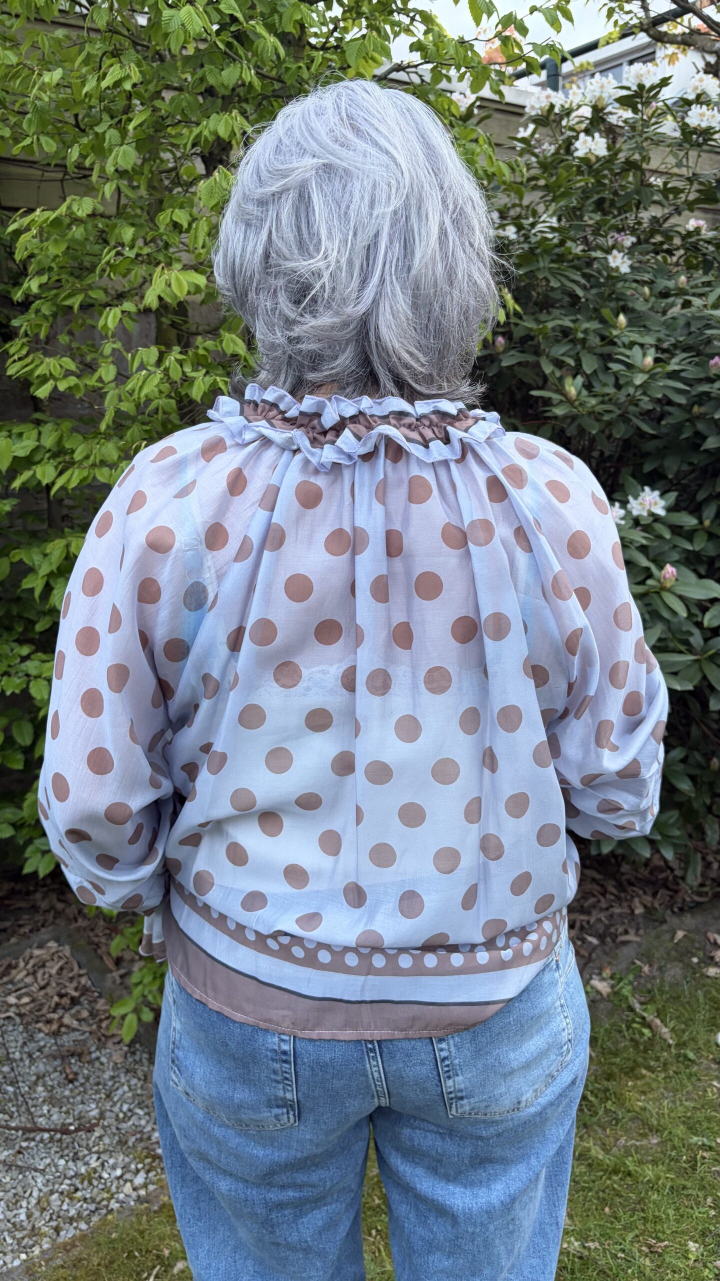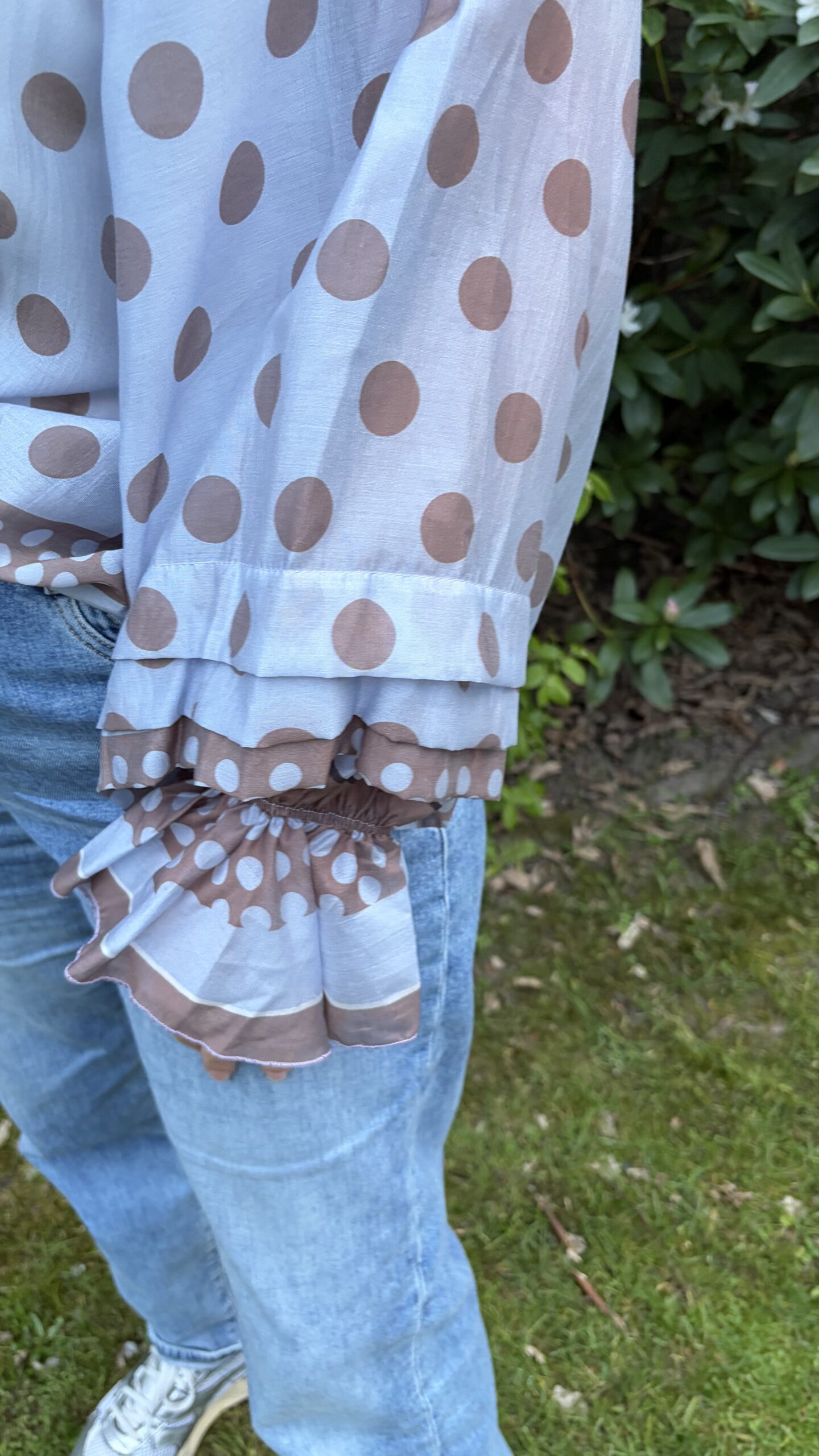 Omschrijving: Blouse met lange brede mouw elastiek met uitlopende boord, recht model met knopen