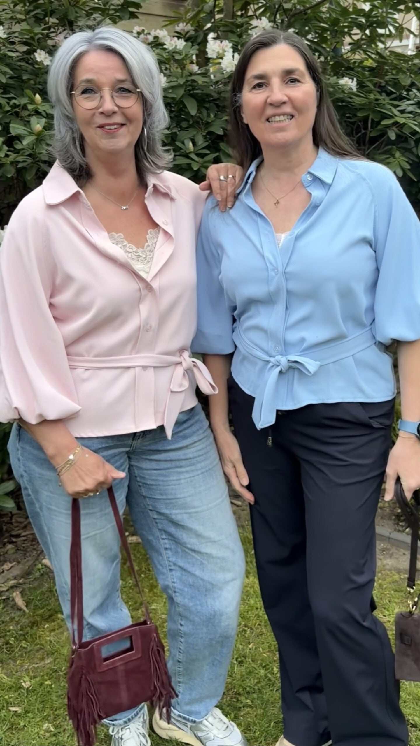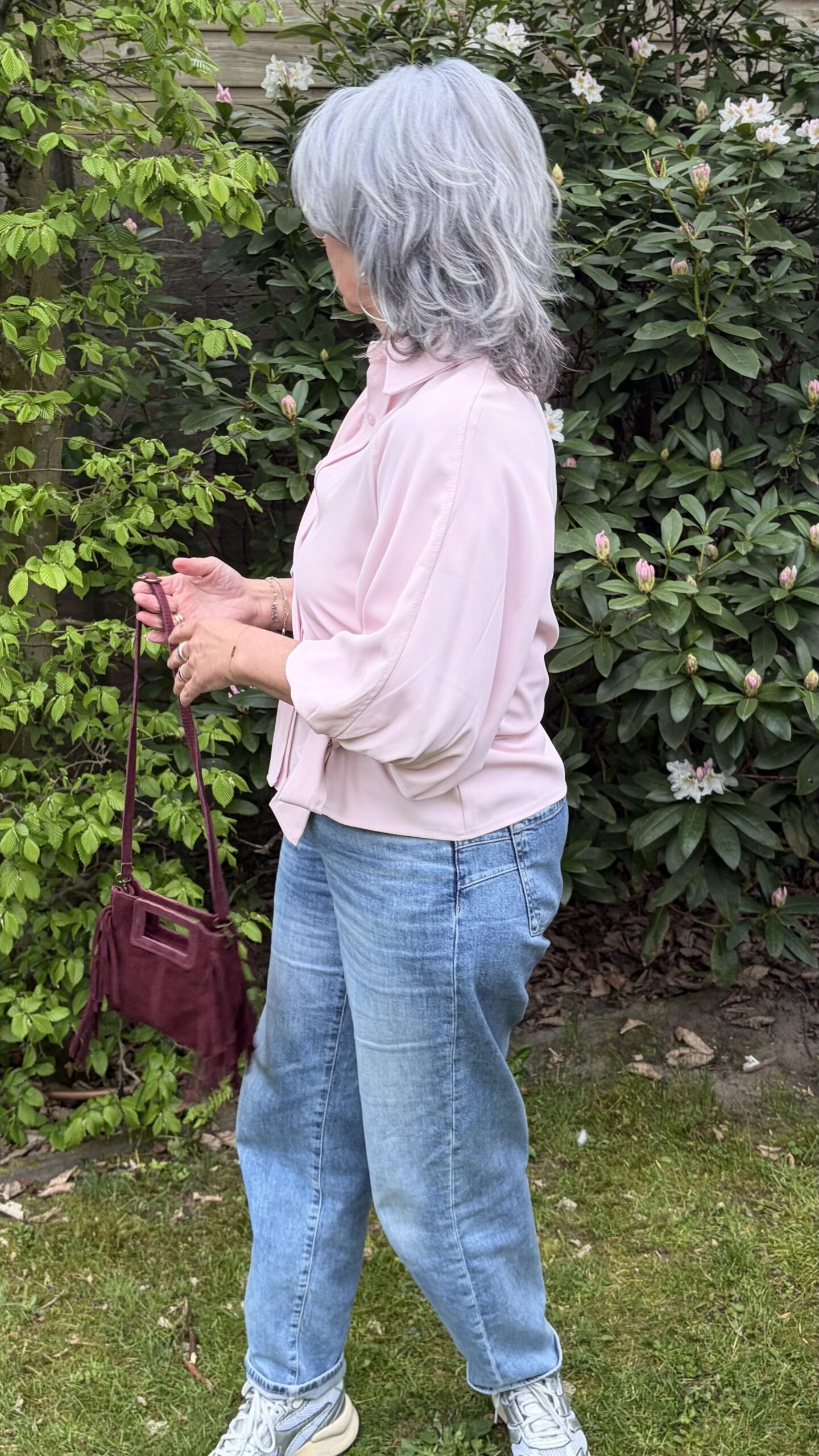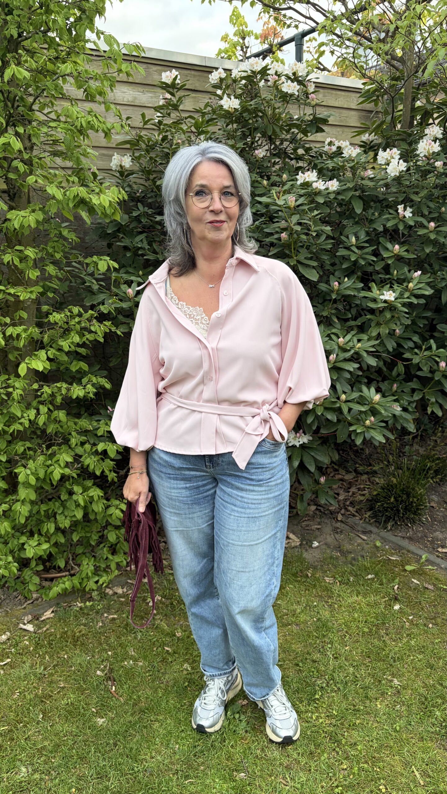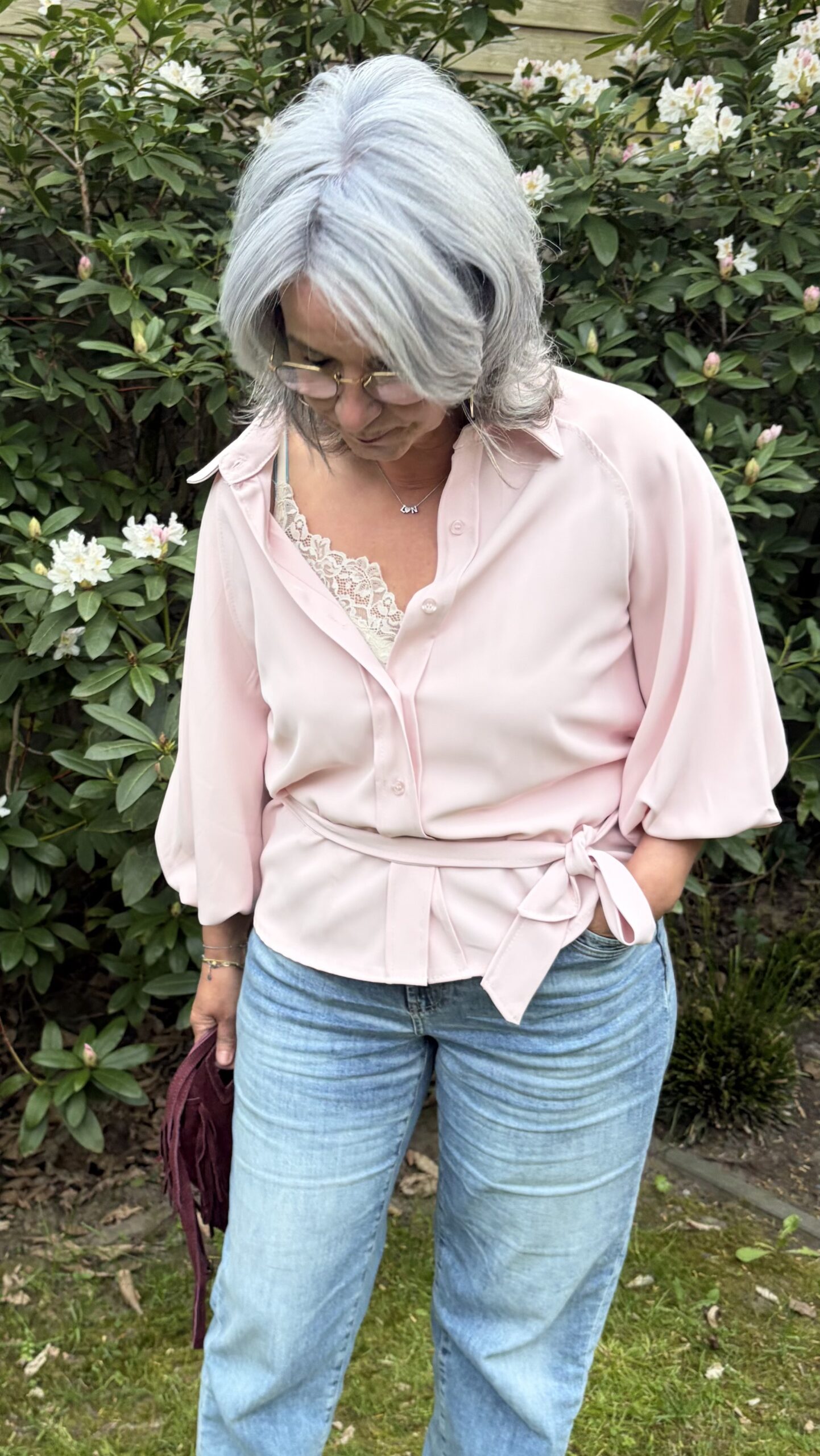 Omschrijving: Blouse met korte pofmouw, recht model met losse ceintuur in de taille