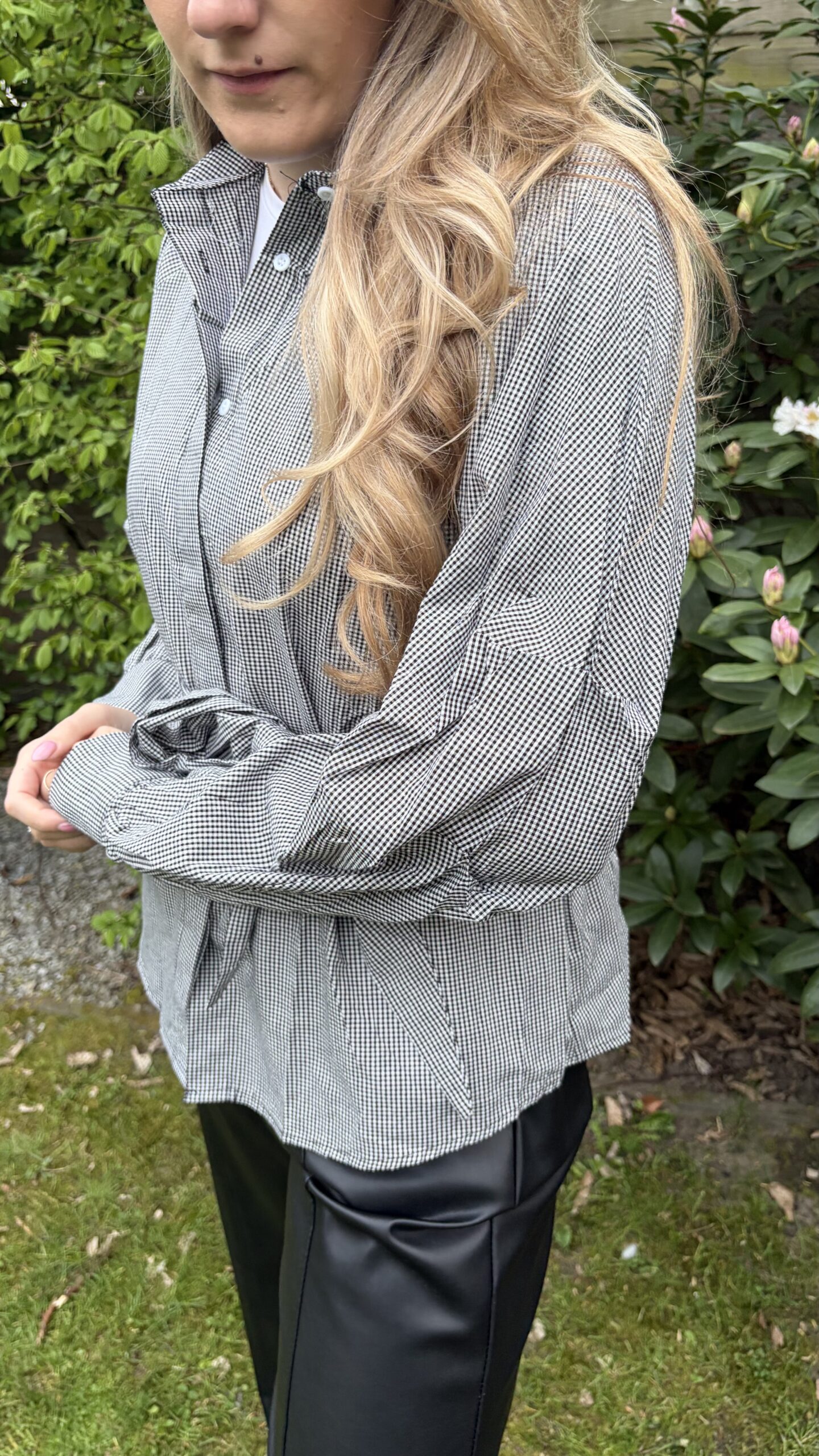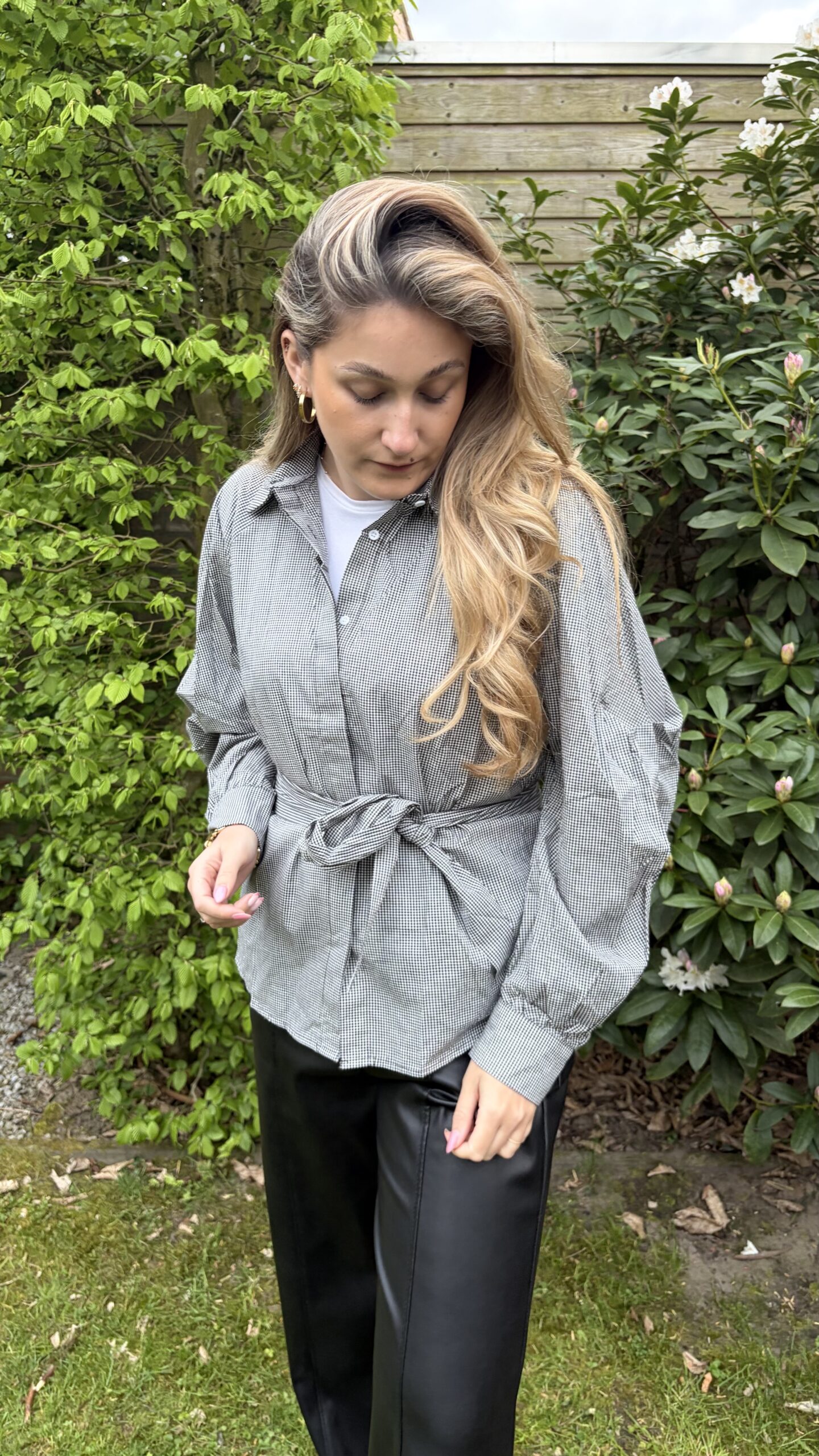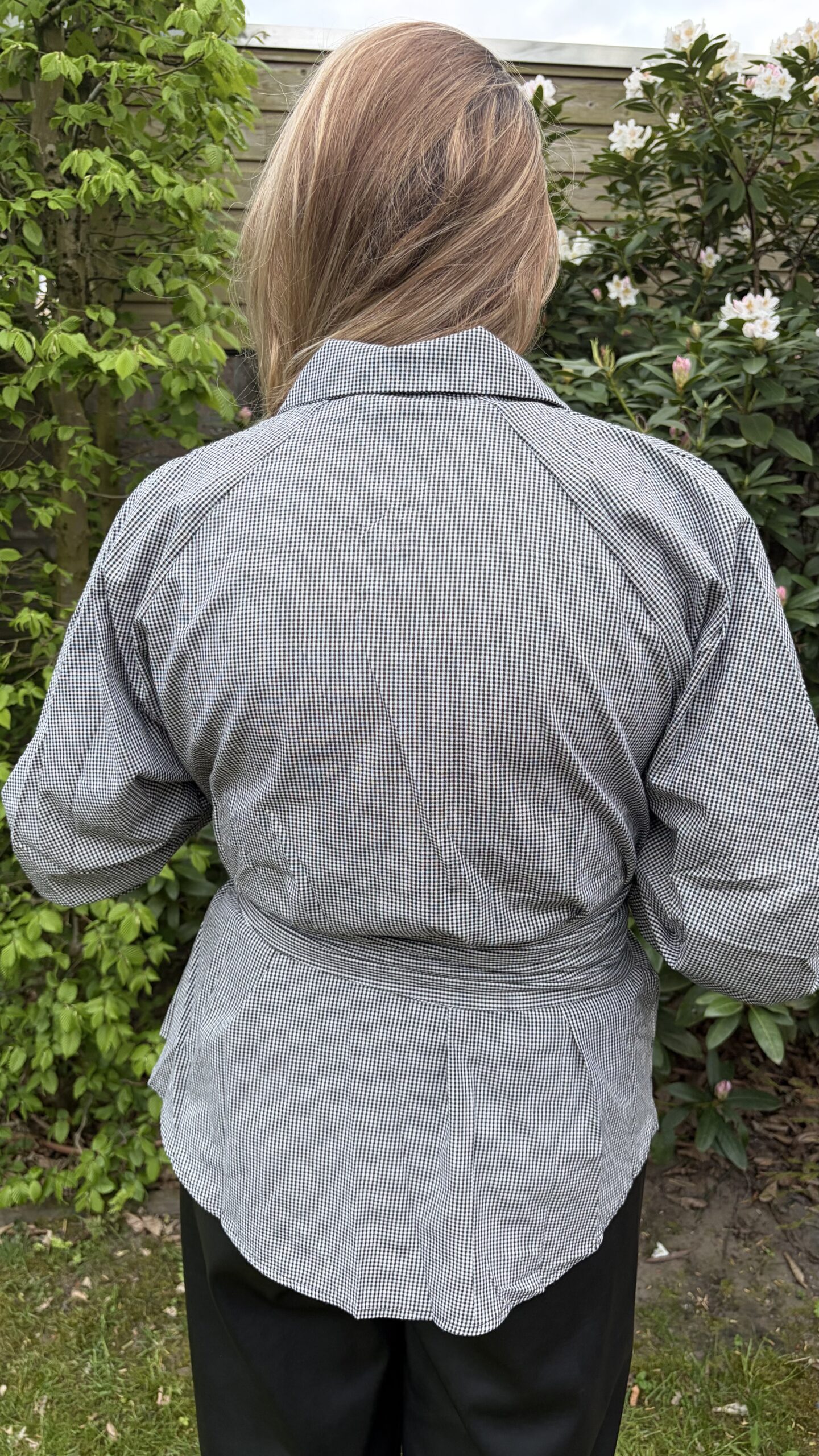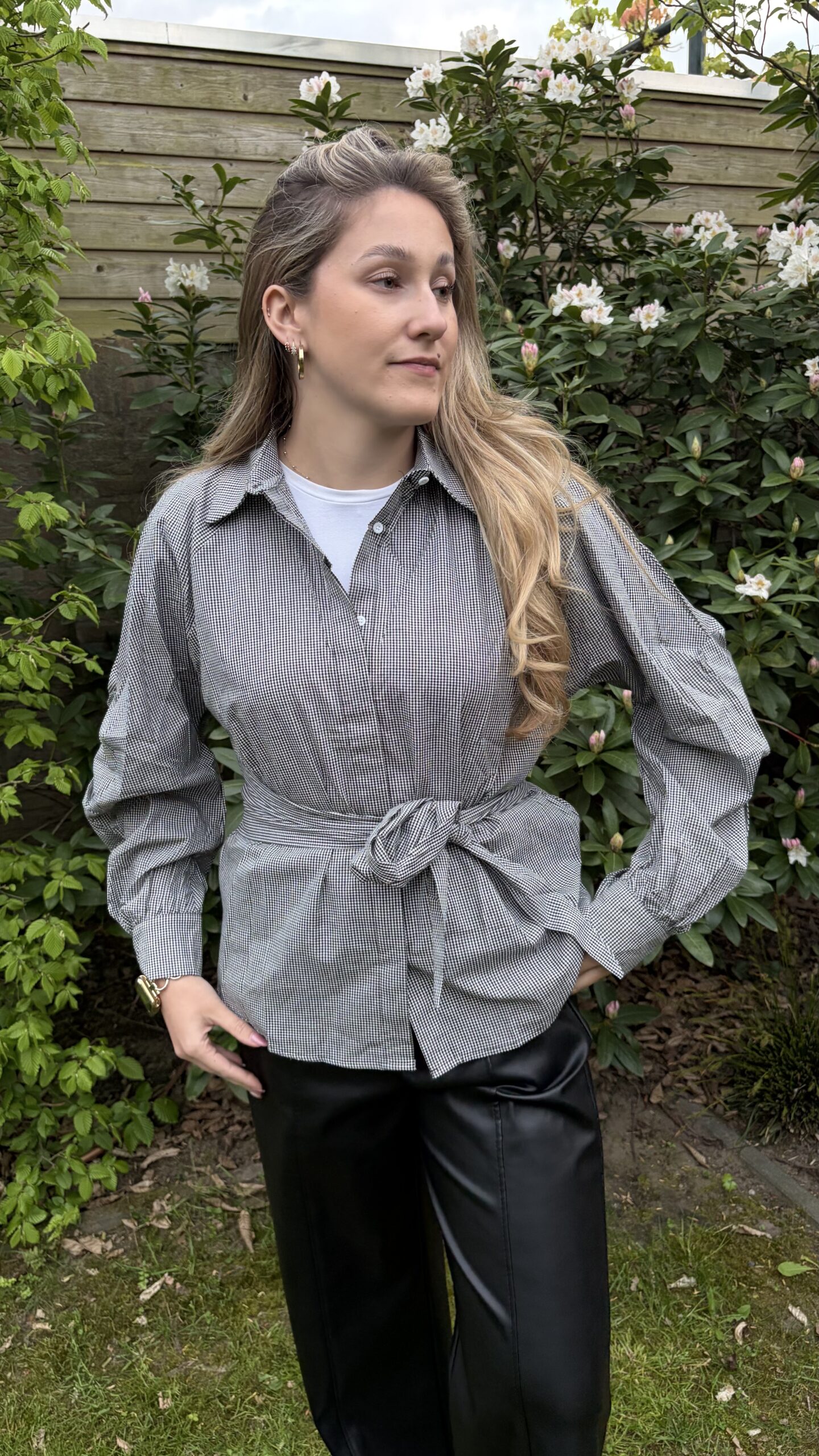 Beschrijving: Blouse valt ruim, knoopsluiting voor, Lange Pof Mouw, klassieke kraag en een band om te strikken in de taille