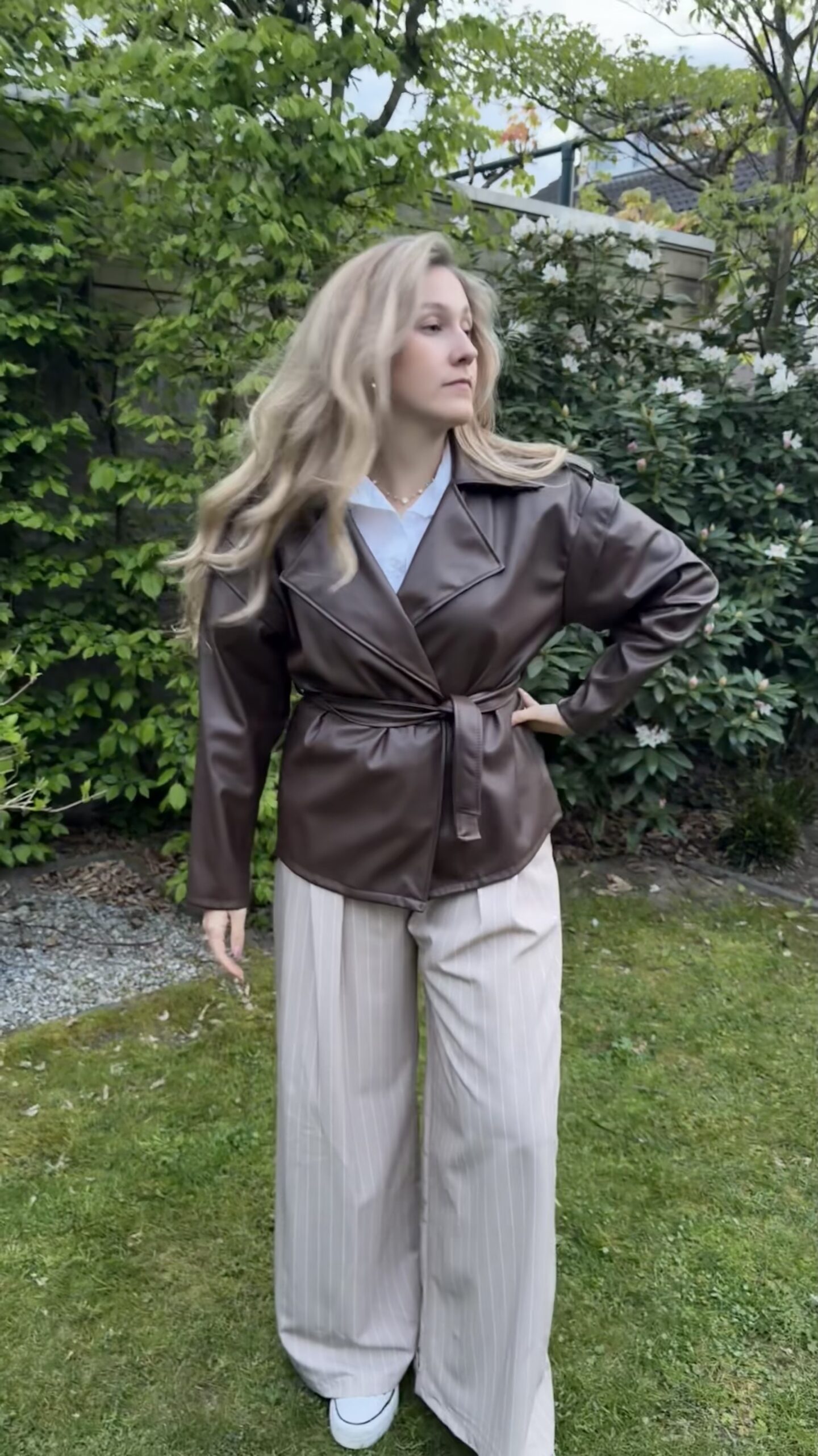 Beschrijving: Binnen en buiten jasje met een reverse kraag, 1 knoop voor, ceintuur in de taille, het is een kort model met een lange mouw