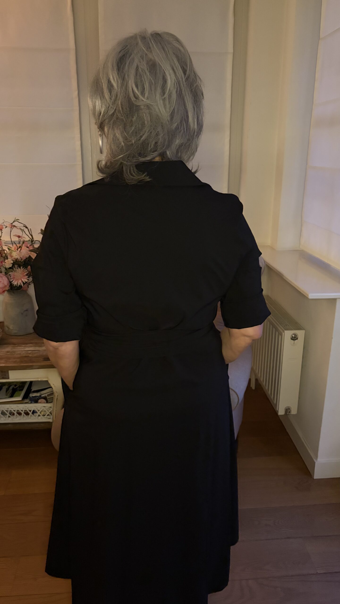 Beschrijving: Jurk van stretch stof, lange mouw ook opgerold te dragen, knoopsluiting voor, heeft een klassieke kraag